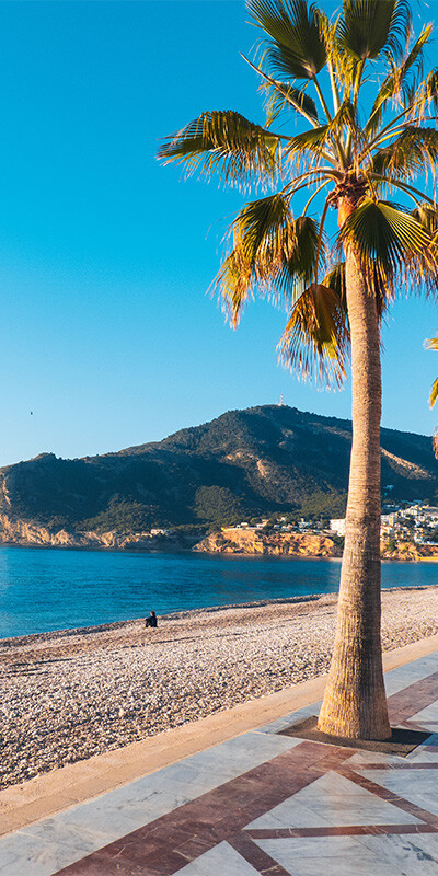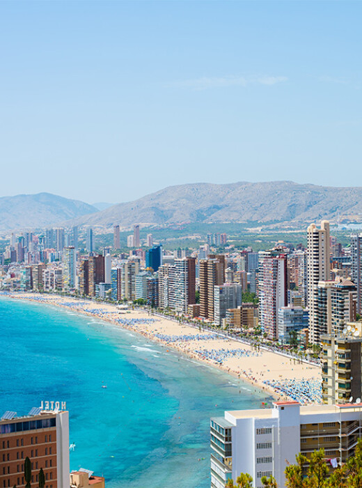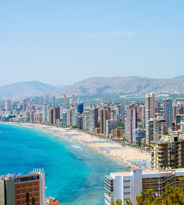 Benidorm is located by the Mediterranean Sea, 40 minutes north of the city of Alicante (Valencian Community) and El Altet Airport. It is the most well-known holiday destination on the Spanish Levante, and therefore is considered the tourist capital of the Costa Blanca.