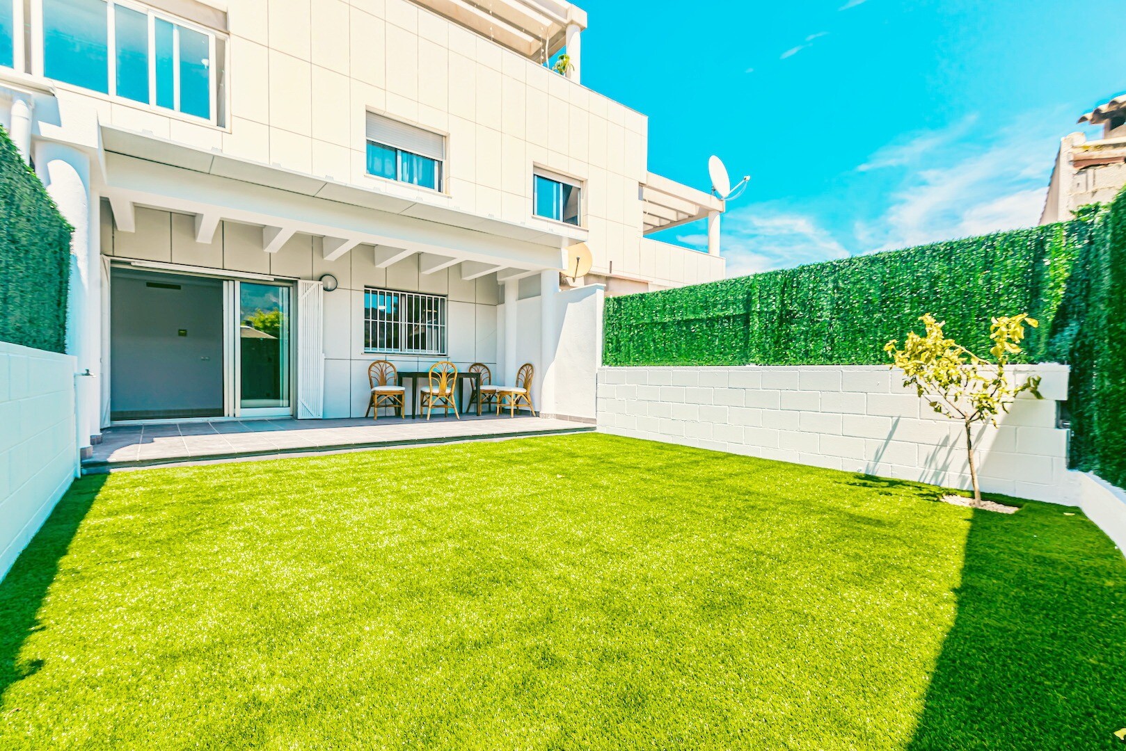 This... magnificent ground floor apartment has a large terrace and garden, perfect for enjoying the Mediterranean climate. The interior space is designed with your well-being in mind, with two comfortable bedrooms, a complete bathroom and an additional toilet with shower, a furnished and equipped kitchen with a utility room, a cozy living-dining room that becomes the ideal space to share with family and friends.