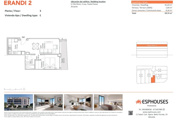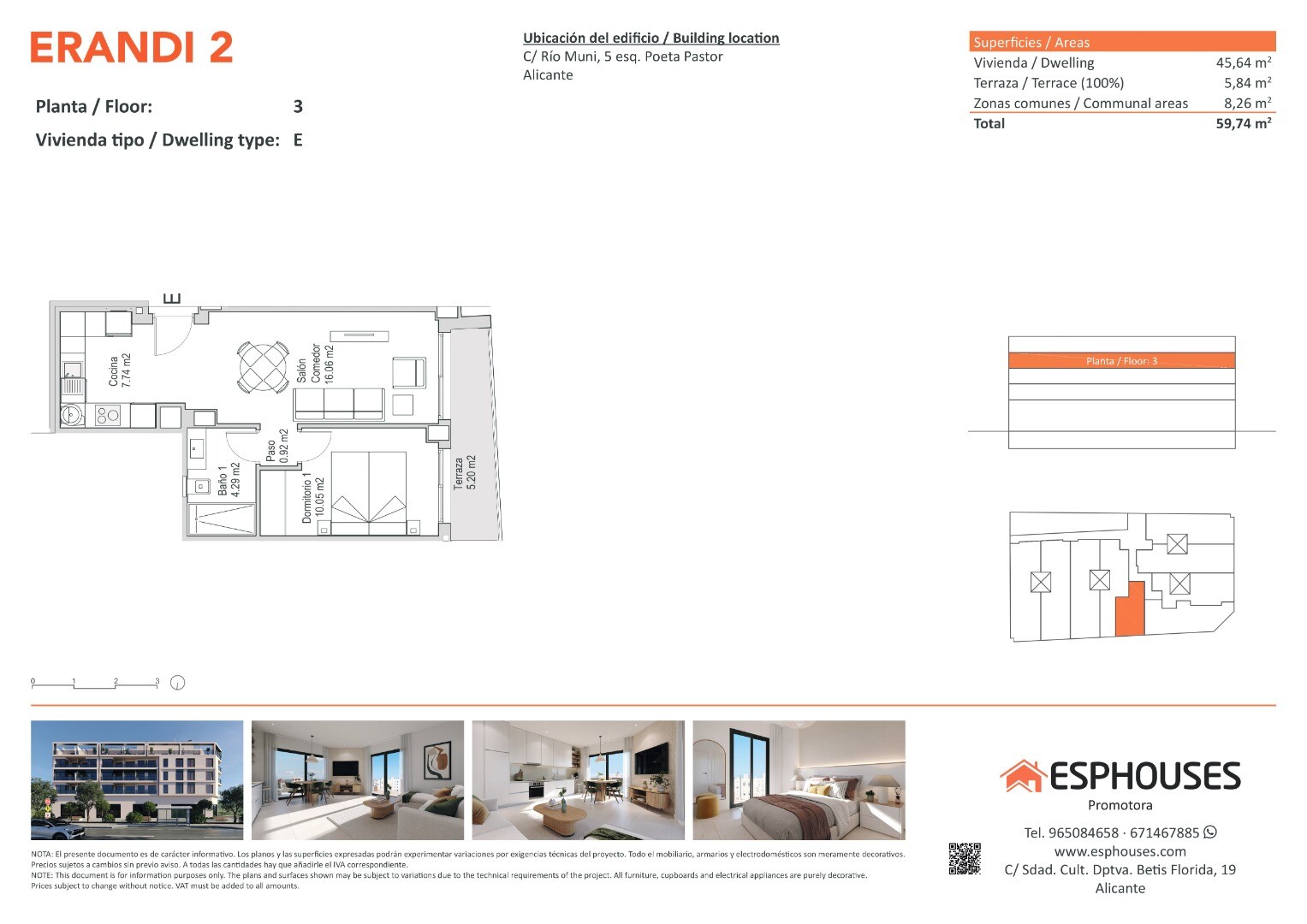 With 45.64 m² built, the property includes one bedroom with a fitted wardrobe, one bathroom, a living-dining area... with open-plan kitchen, and a private west-facing terrace of 5.84 m² — perfect for enjoying the afternoon sun.