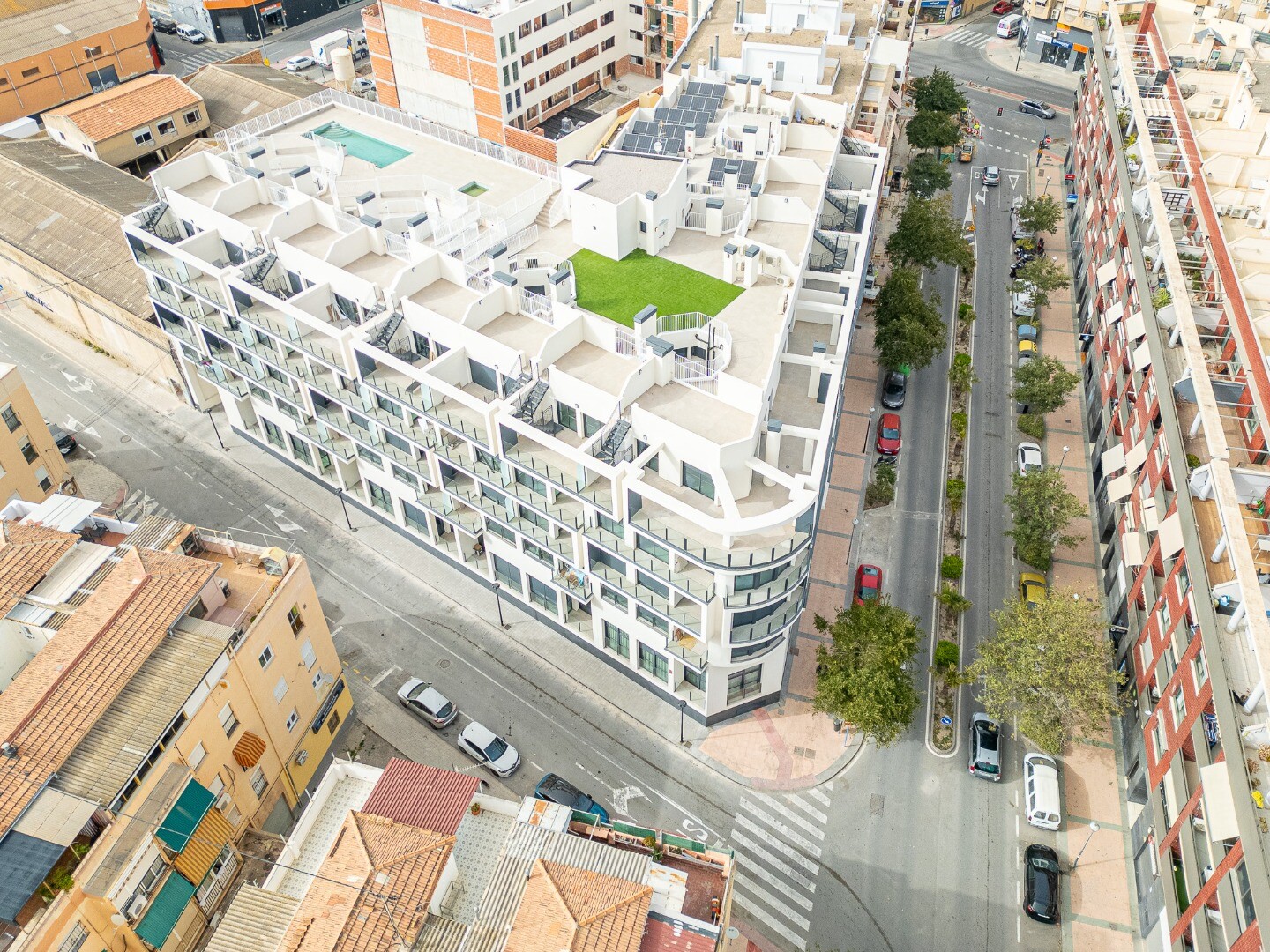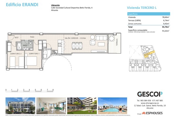The ERANDI Building is located just a few minutes’ walk from Puerta de Alicante shopping centre, only 2 km from the beach and 12 km from Alicante–Elche Airport. It offers excellent public transport connections, allowing access to Alicante city centre in approximately 10–15 minutes, perfectly combining residential tranquillity with proximity to all services and leisure areas.