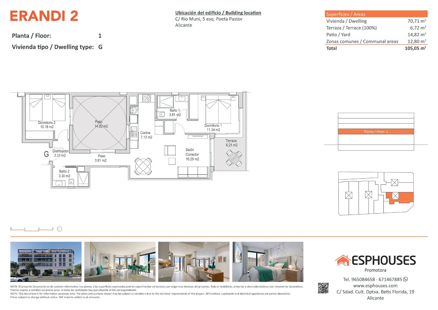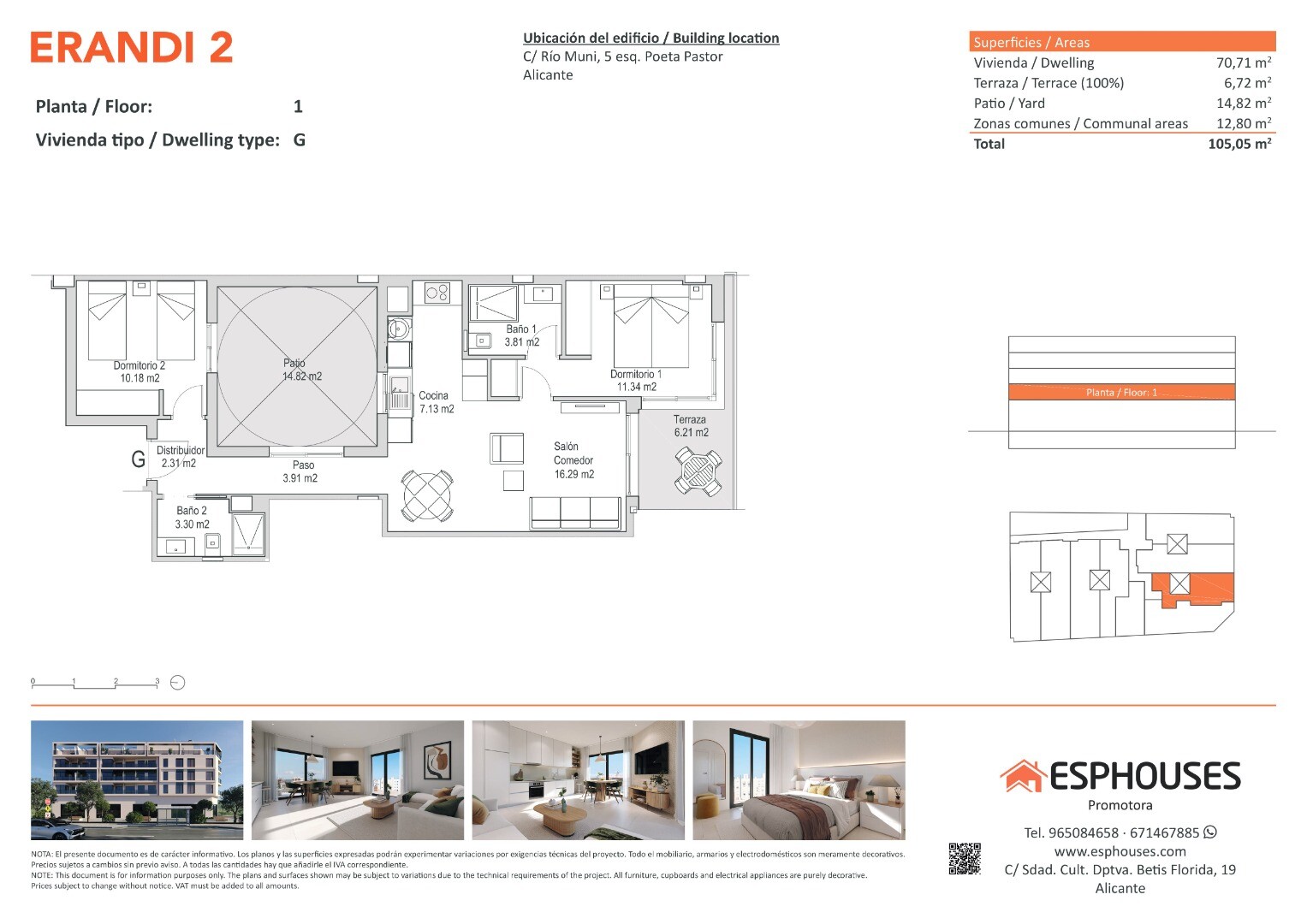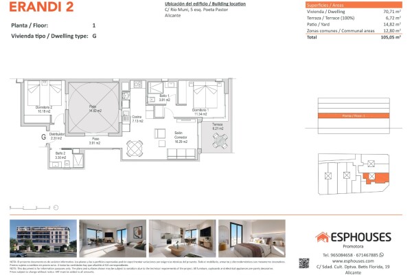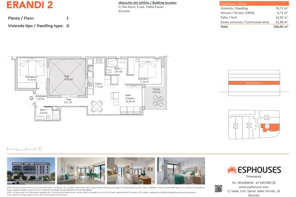 This new-build flat is located on the first floor of the ERANDI 2 building and offers a total built area of 70.71 m². The layout includes two bedrooms with built-in wardrobes, two full bathrooms, a living-dining room with an open-plan kitchen, and a 6.72 m² south-facing terrace, complemented by a spacious 14.82 m² private patio — perfect for enjoyi...ng the outdoors all year round.