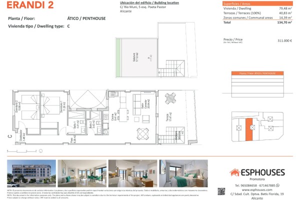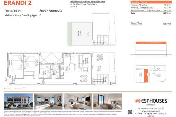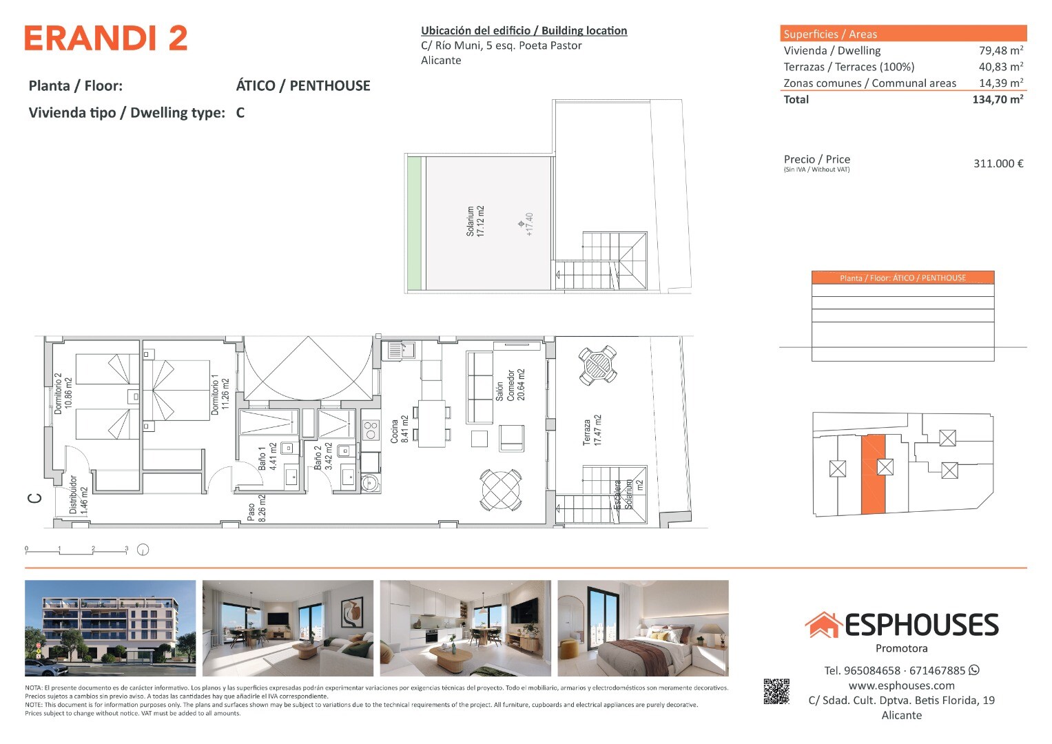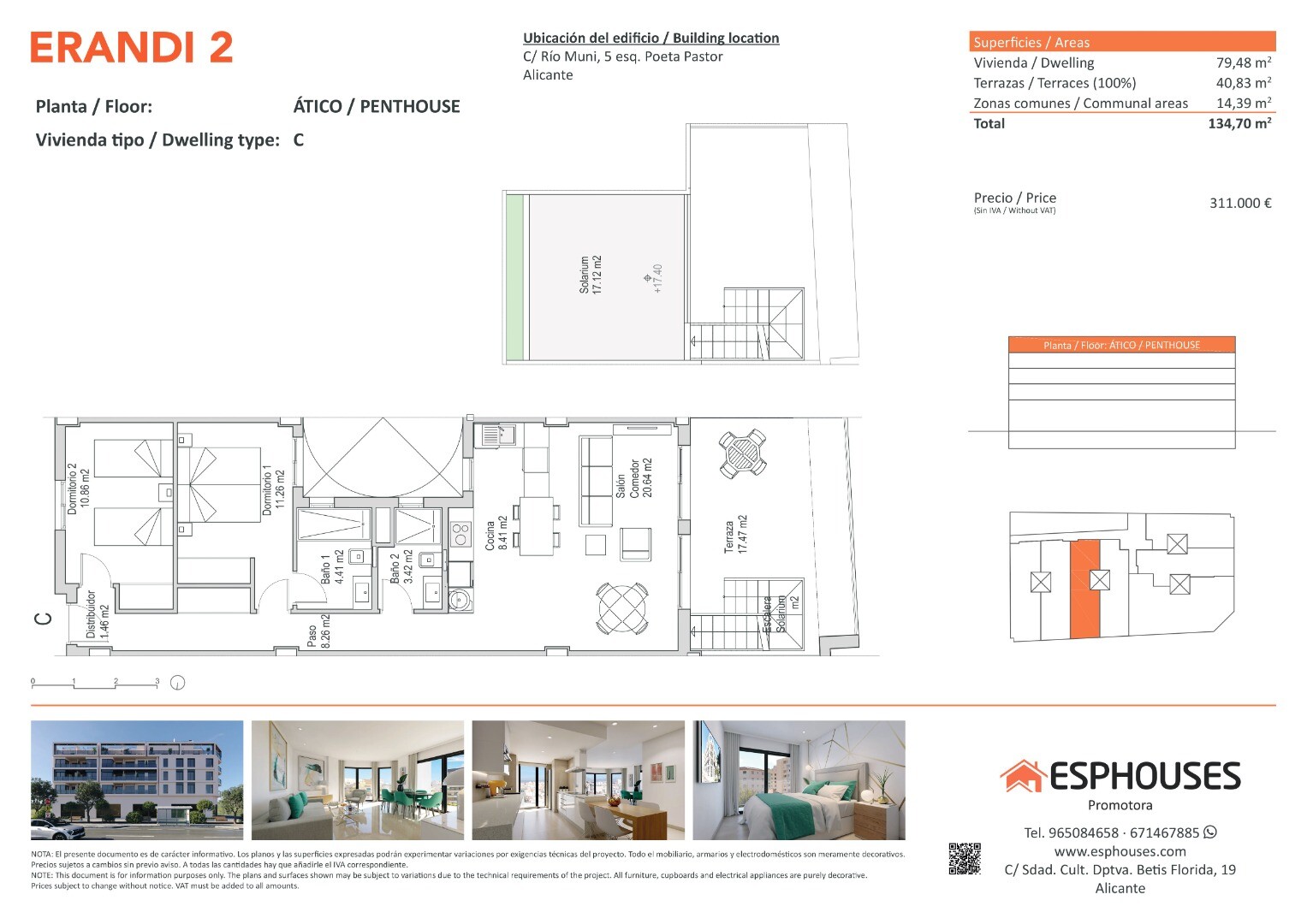 This bright new‑build penthouse is located on the fourth floor of the ERANDI 2 building, in Alicante’s emblematic La Florida neighbourhood — well connected and in full development. The property offers 79.48 m² of built area and comprises two bedrooms with built‑in wardrobes, two full bathrooms, and a spacious living‑dining room with modern open‑pla...n kitchen, designed to maximise space and natural light.