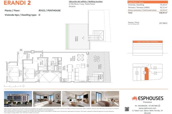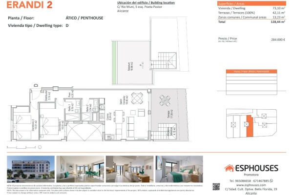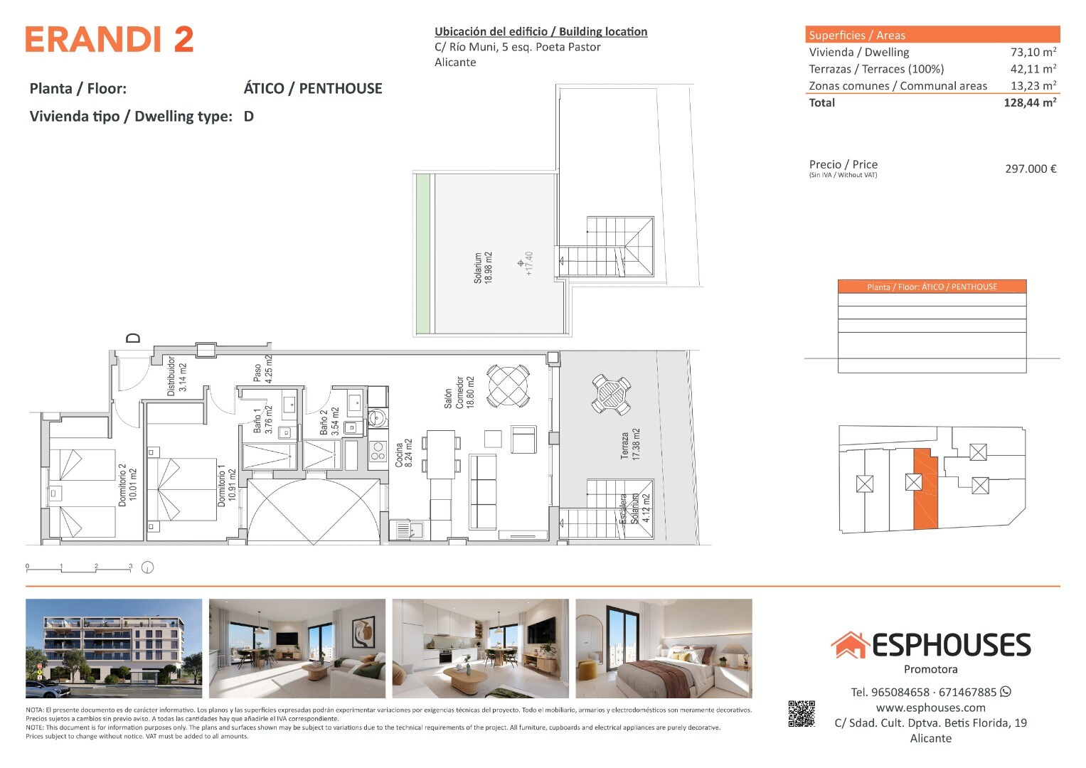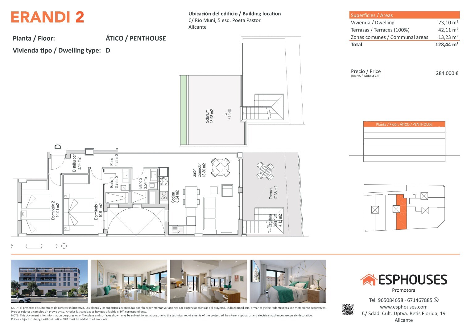 This modern new-build penthouse is located on the fourth floor of the ERANDI 2 Building, in the emblematic neighbourhood of La Florida, a well-connected and thriving area of Alicante. With 73.10 sqm built, the property features two bedrooms with fitted wardrobes, two full bathrooms, and a bright open-plan living-dining room with a contemporary kitc...hen design that maximises natural light.