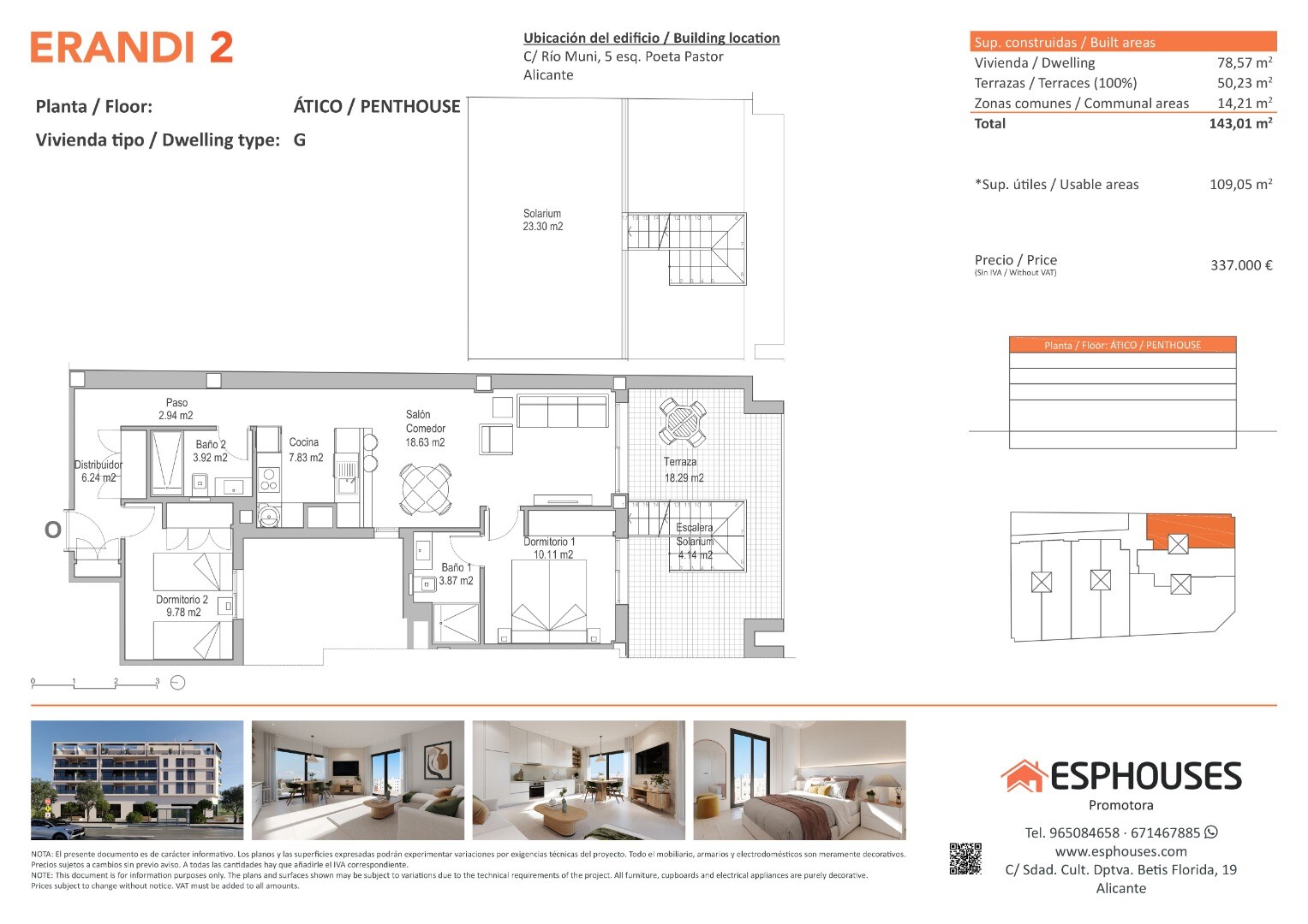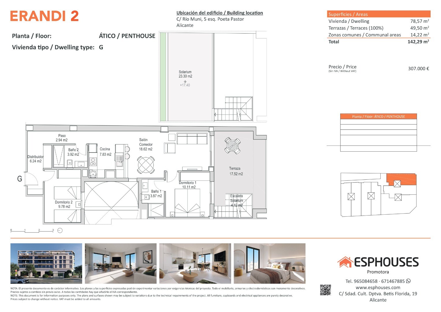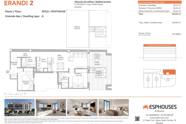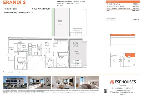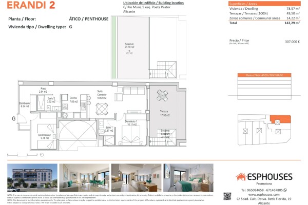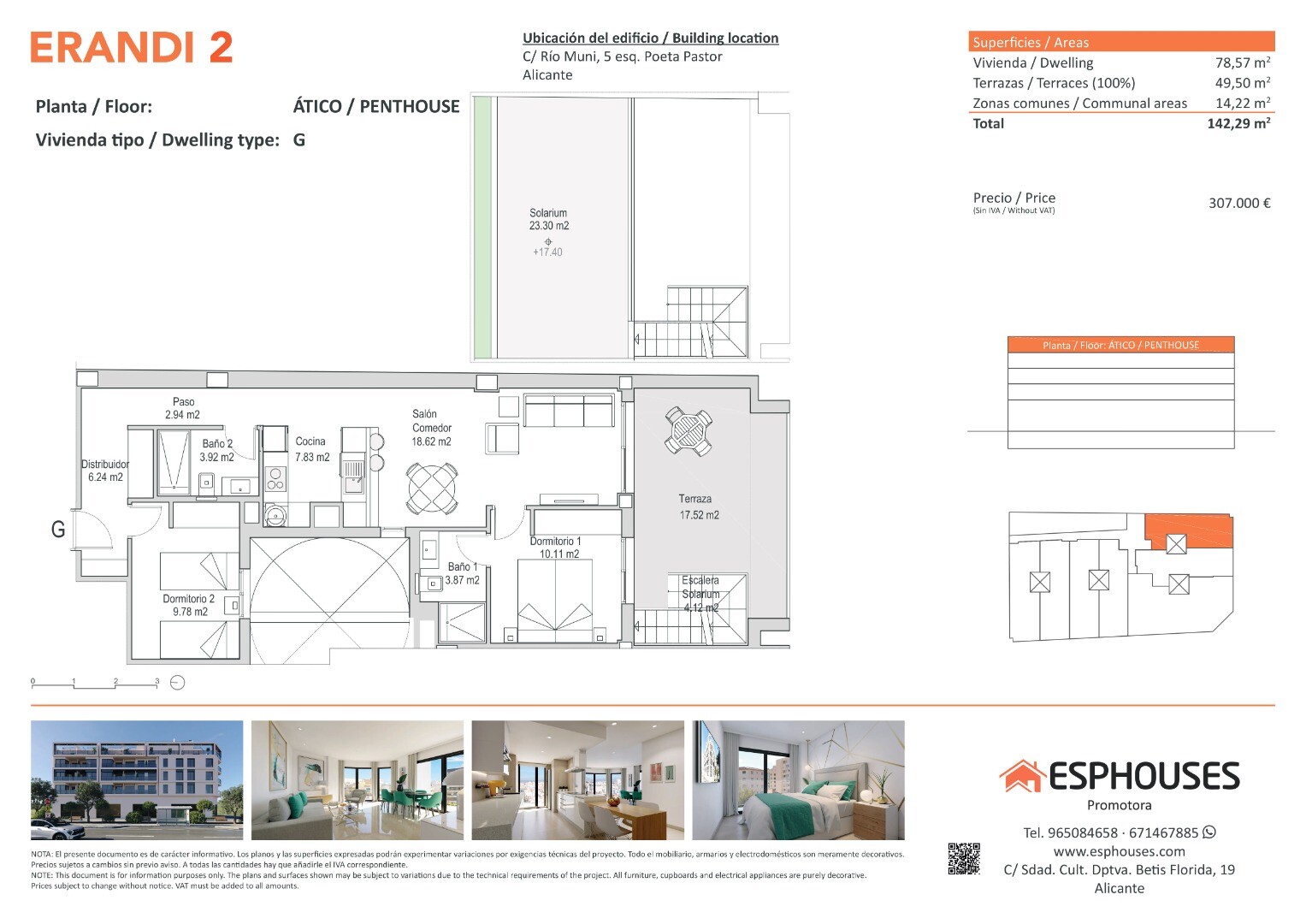 This elegant new-build penthouse is located on the fourth floor of the ERANDI 2 building, in the emblematic La Florida neighbourhood – a well-connected area with all services nearby in the city of Alicante. The property offers 78.57 m² of built space, featuring two bedrooms with fitted wardrobes, two full bathrooms and a bright living-dining room w...ith an open-plan kitchen in a modern, functional layout.