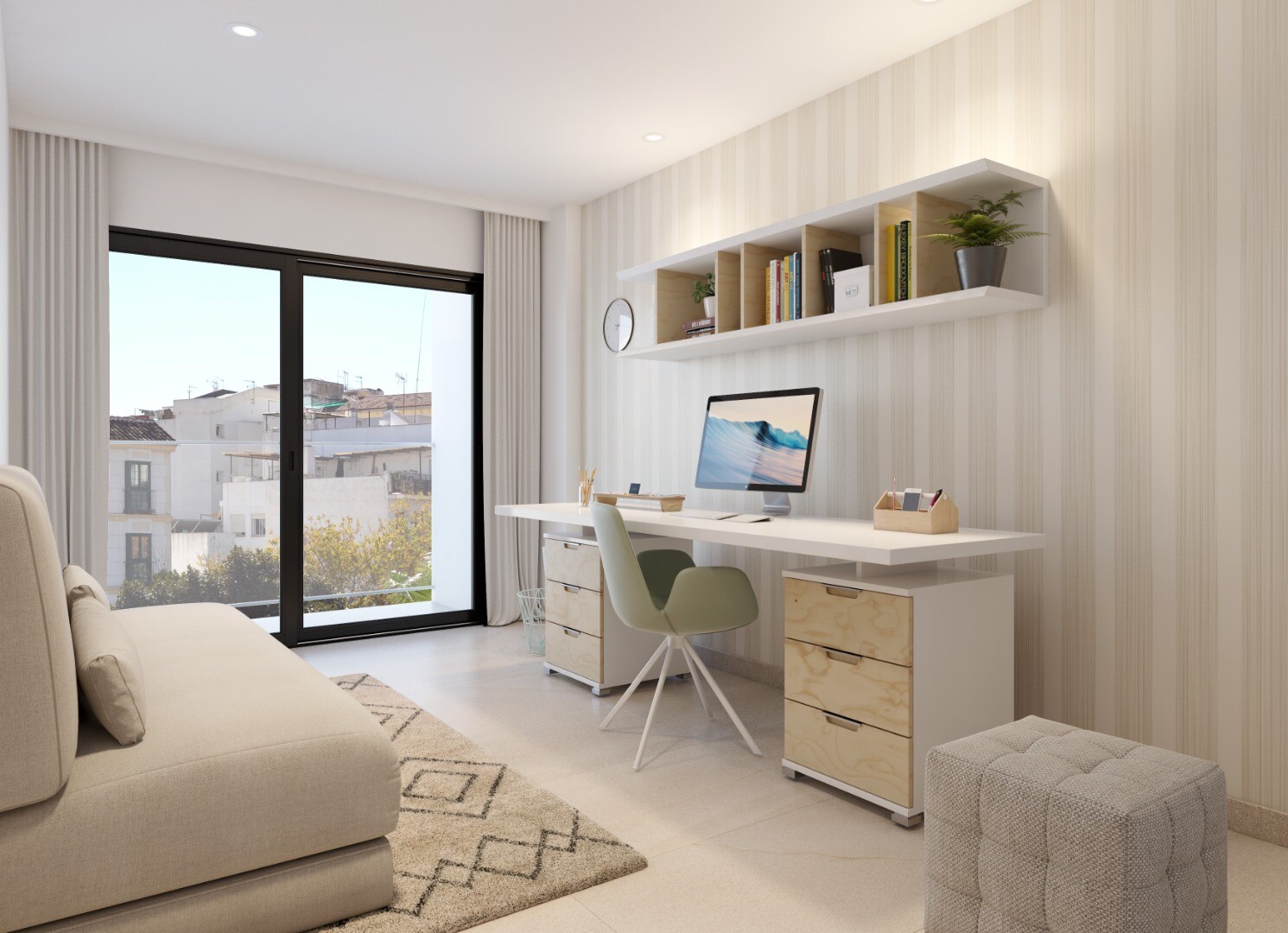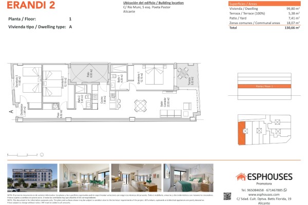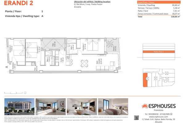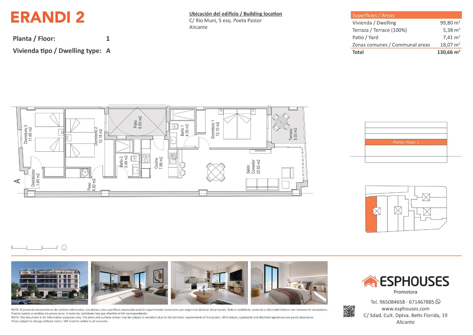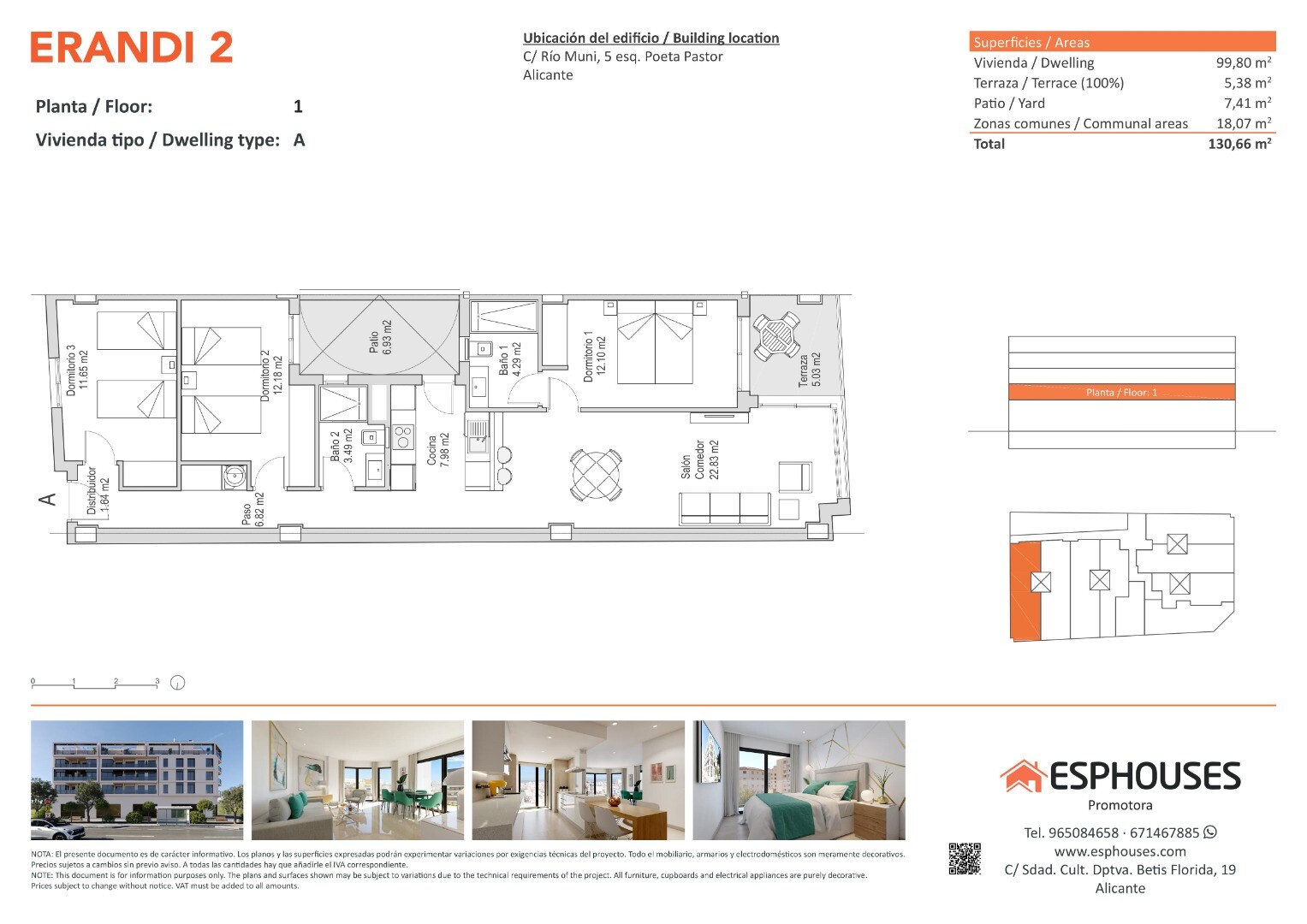 This new-build flat on the first floor of the ERANDI 2 building offers a generous built area of 99.80 m², a smart layout and two outdoor spaces: a 5.38 m² terrace and a 7.41 m² patio — perfect for enjoying Alicante’s pleasant climate.