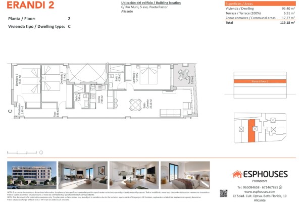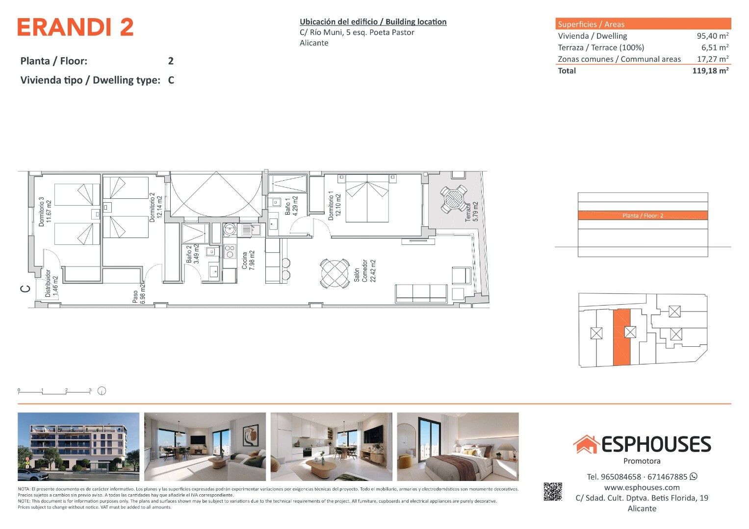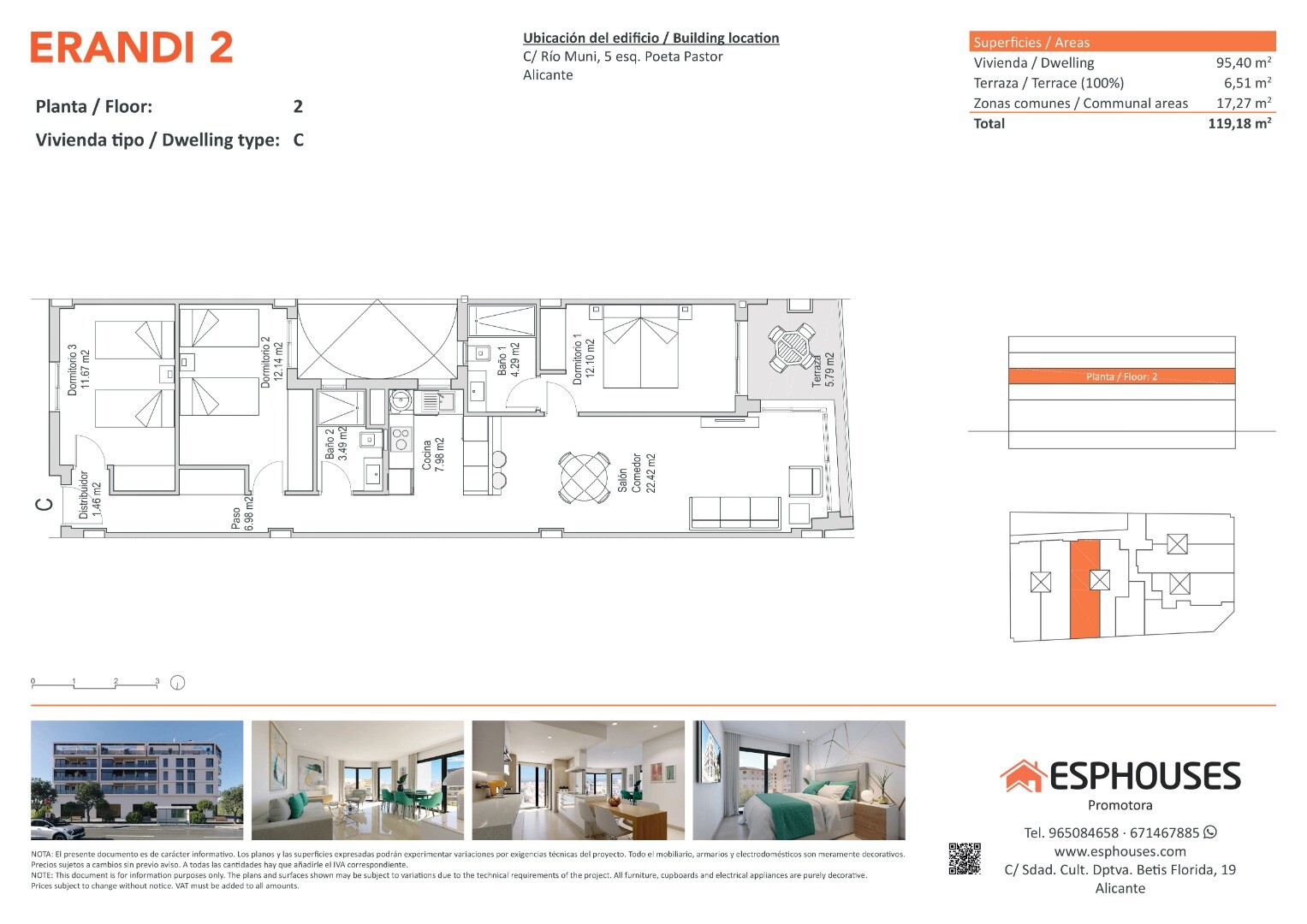 This modern new-build property is located on the second floor of the Edificio ERANDI 2, a contemporary residential building with a communal rooftop pool, situated in the well-known La Florida neighbourhood — a well-connected area with all amenities in Alicante. With a built area of 95.40 m², the flat features three bedrooms with fitted wardrobes, t...wo full bathrooms, a spacious living-dining room with open-plan kitchen and a 6.51 m² west-facing terrace, perfect for relaxing in the afternoon sun.