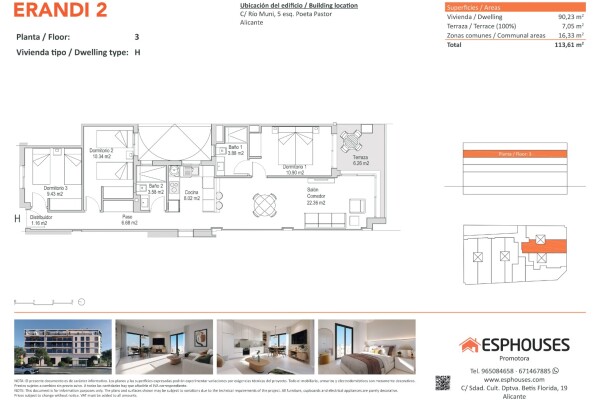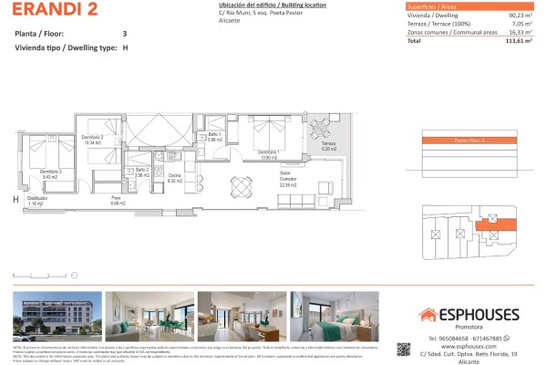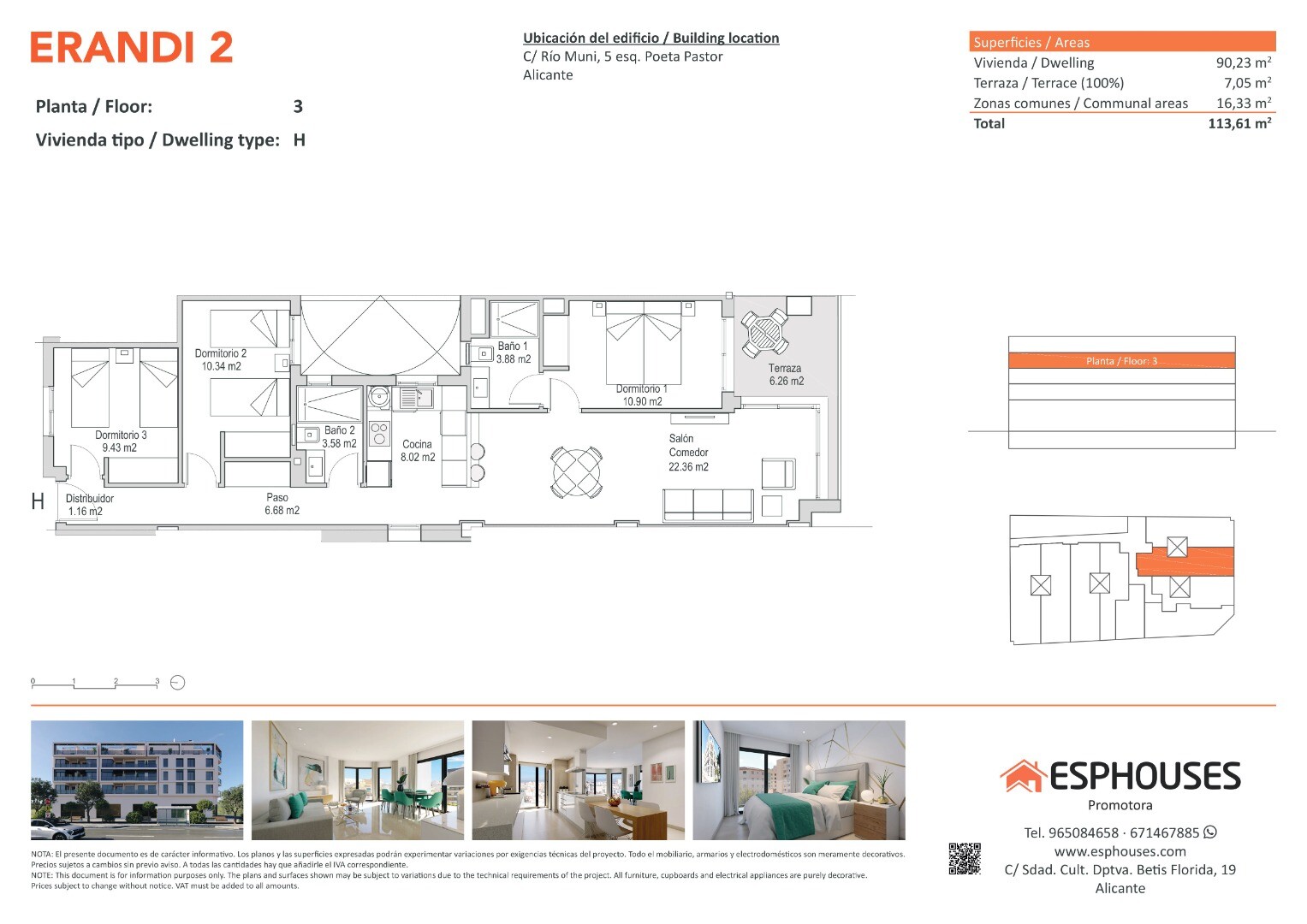 This newly built flat is located on the third floor of the ERANDI 2 building and offers a total built area of 90.23 m². Its modern and functional design, combined with excellent southern orientation, makes it an ideal option in the iconic neighbourhood of La Florida — a well-connected residential area in Alicante.