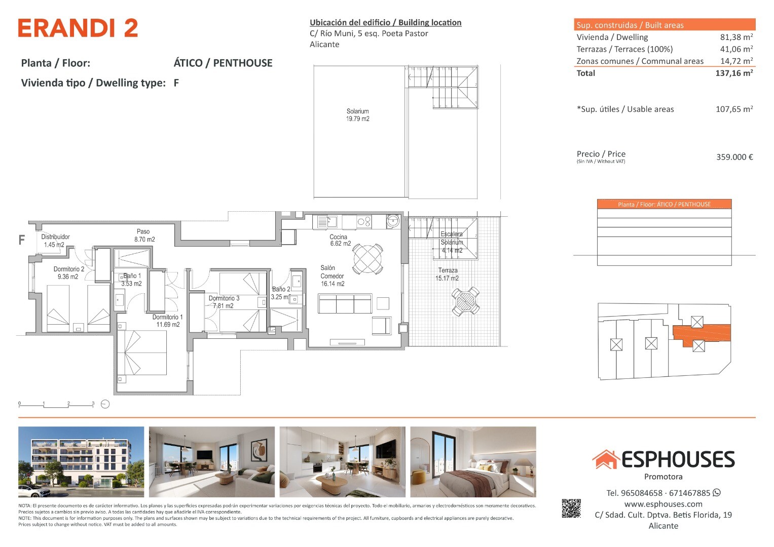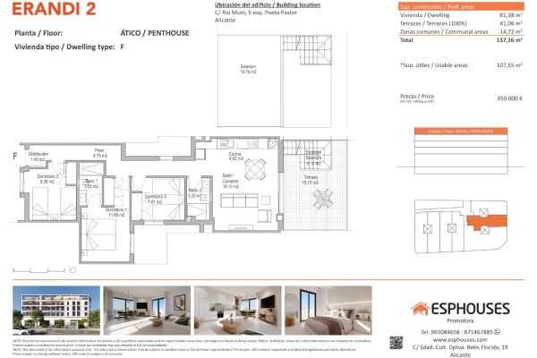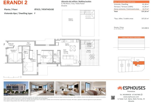 This new-build penthouse is located on the fourth floor of the ERANDI 2 building, in the emblematic neighbourhood of La Florida, a well-connected and established area of Alicante. The property offers 81.38 m² of built space distributed across three bedrooms with fitted wardrobes, two full bathrooms, and a spacious living-dining room with an open-pl...an kitchen, designed in a modern and functional layout.