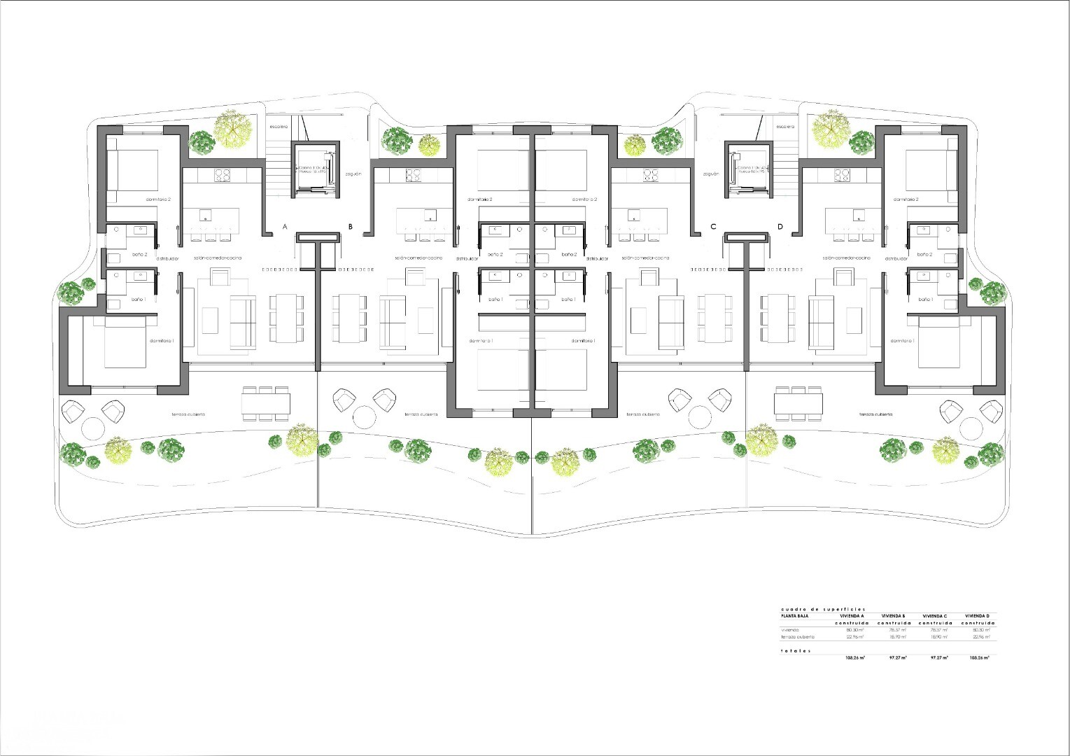 Apartments with living room, kitchen, 2 bedrooms and 2 bathrooms and large terraces in each apartment.
