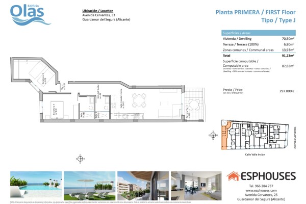 Located in one of the most sought after areas of Guardamar del Segura, on the prestigious Avenida de Cervantes, the Edificio Olas will be a perfect choice due to its proximity to the beach and its wide variety of services available. This magnificent building will have a swimming pool and a solarium on its terrace, providing its residents with an oa...