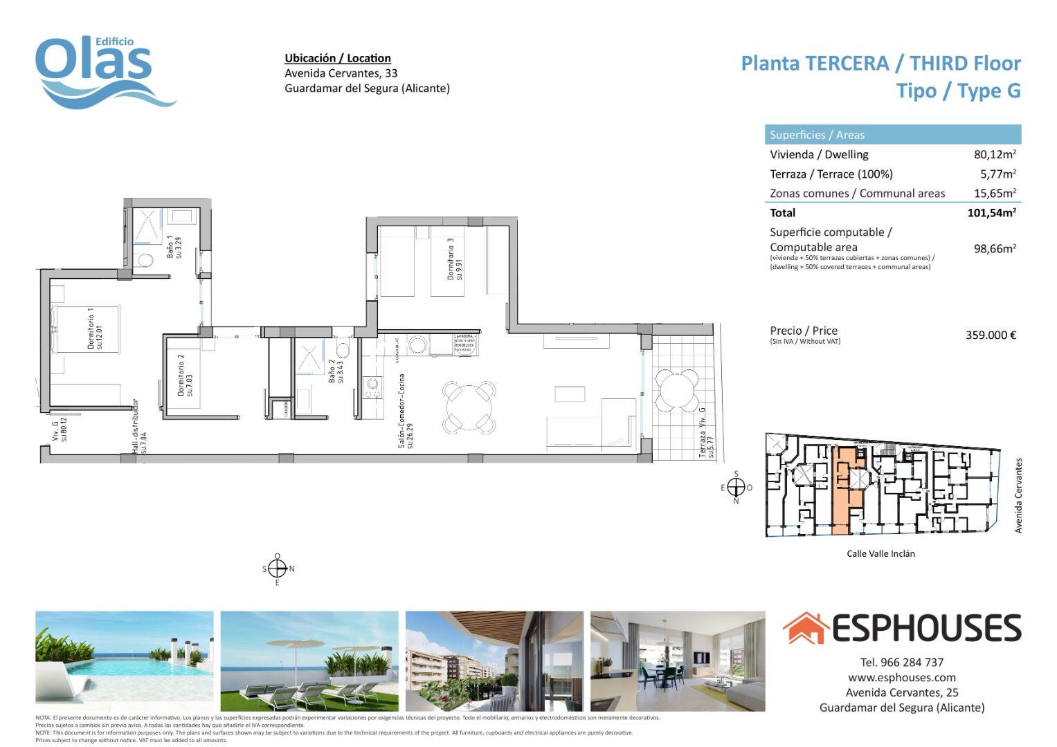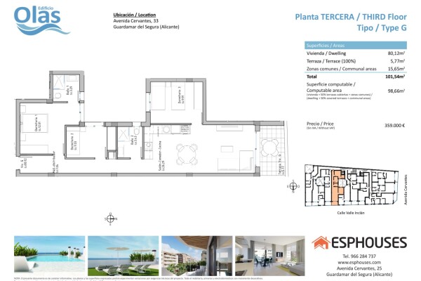 Located in one of the most sought after areas of Guardamar del Segura, on the lively Avenida de Cervantes, Edificio Olas will be a perfect choice due to its proximity to the beach and a wide variety of amenities. This impressive building will offer exceptional amenities, including a swimming pool and rooftop solarium, guaranteeing moments of relaxa...