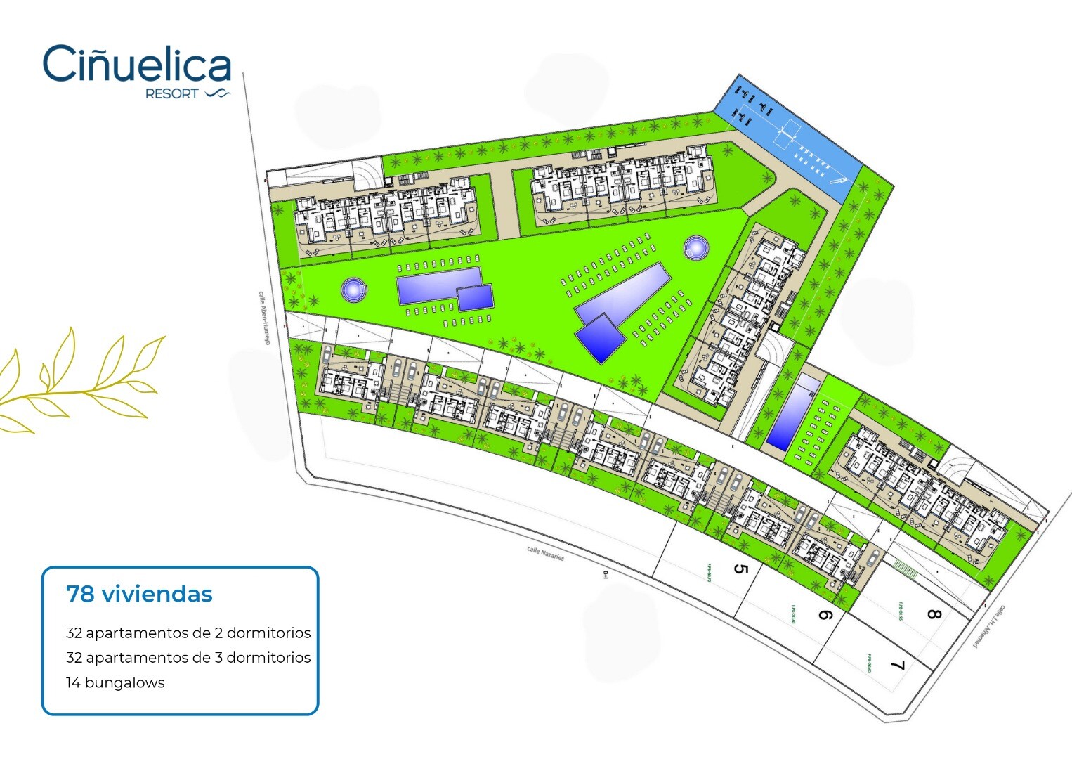 La Cinuelica Resort is a residential complex consisting of 4 apartment blocks with a total of 32 2 bedroom apartments, 32 3 bedroom apartments and 14 bungalows with 3 bedrooms. The apartments are delivered with underground parking space and storage room, kitchen appliances (fridge-freezer-combi, ceramic hob, oven, microwave, dishwasher, washing mac...hine and extractor hood), electric shutters, aerothermic water boiler, pre-installation A/C by means of air ducts and for the roof solariums pre-installation for outdoor kitchen and Jacuzzi. The communal areas include landscaped gardens with 3 swimming pools and 2 heated Jacuzzis, an outdoor gym and a playground. The residential complex is located 1000m from the beach of Punta Prima and 500m from the commercial centres with supermarket, bars, restaurants, ATM, shops etc.