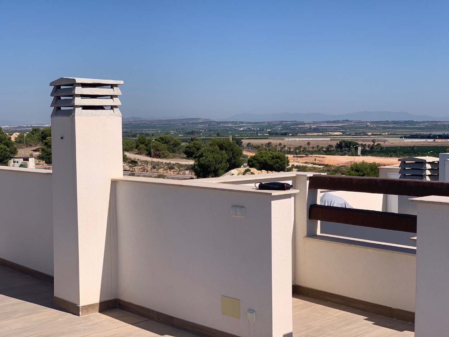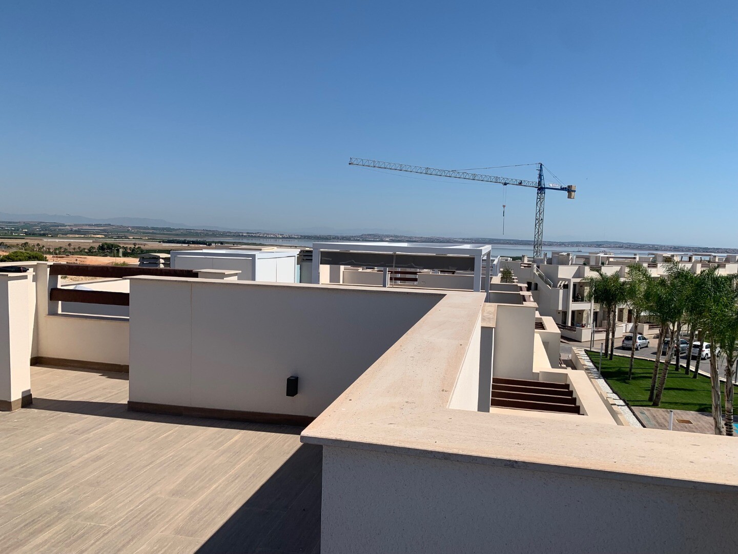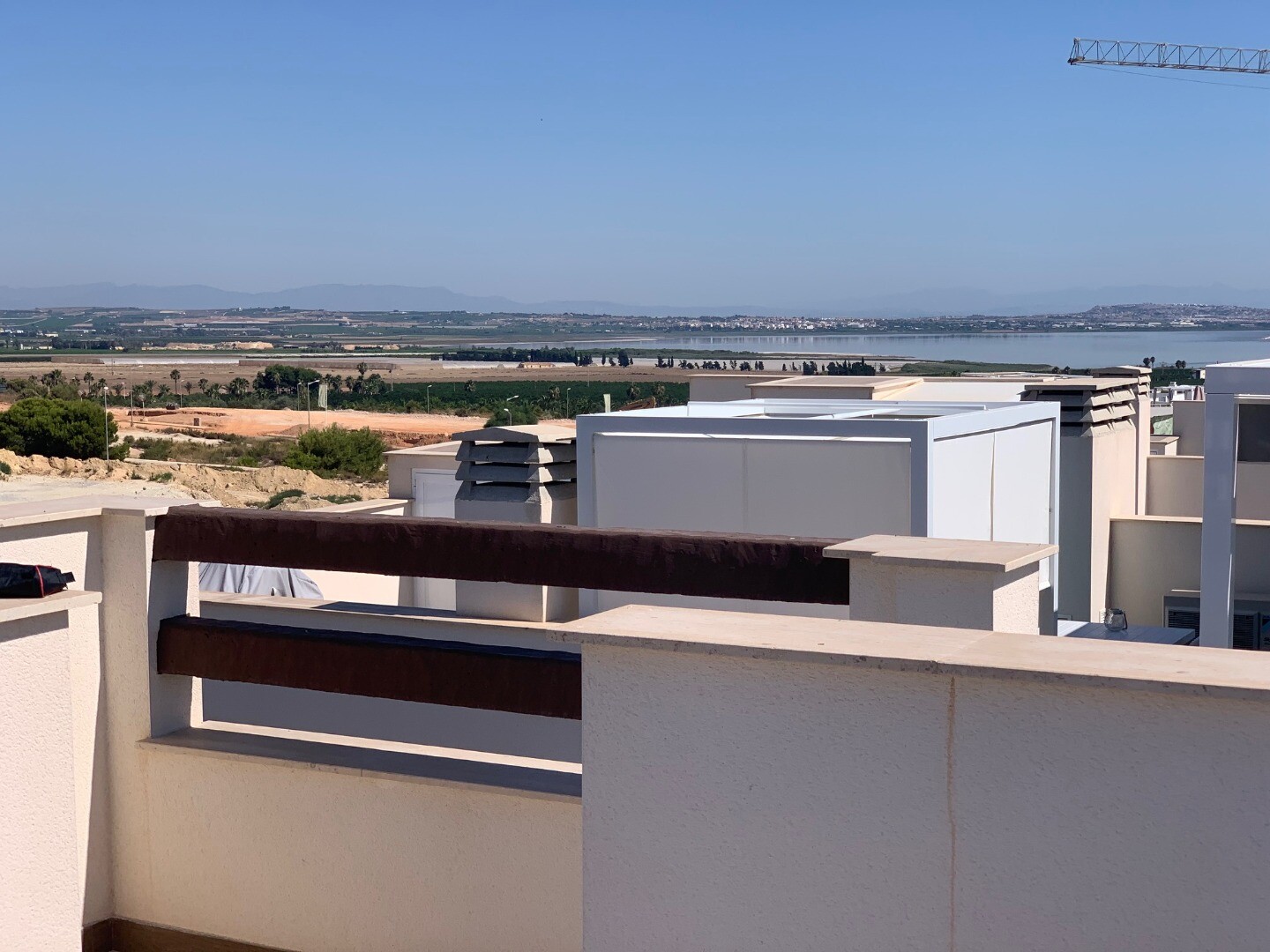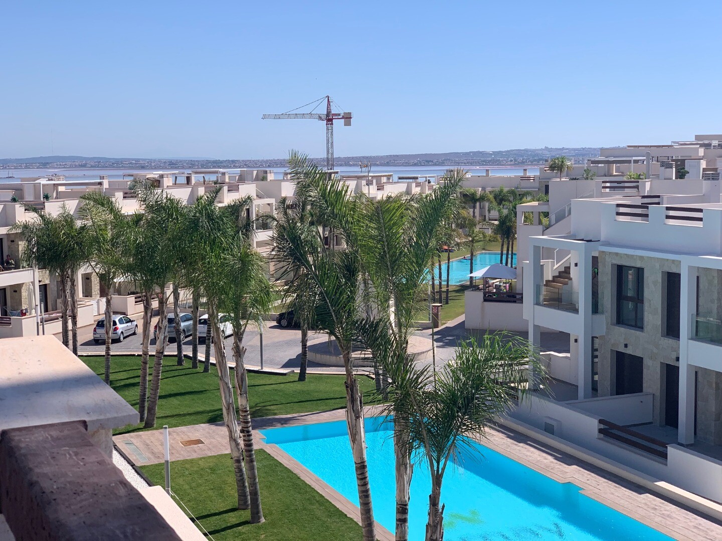 From the solarium you have a beautiful view over the pink salt lake of Torrevieja, as well as a little view of the sea. The balcony overlooks the communal garden and swimming pool.