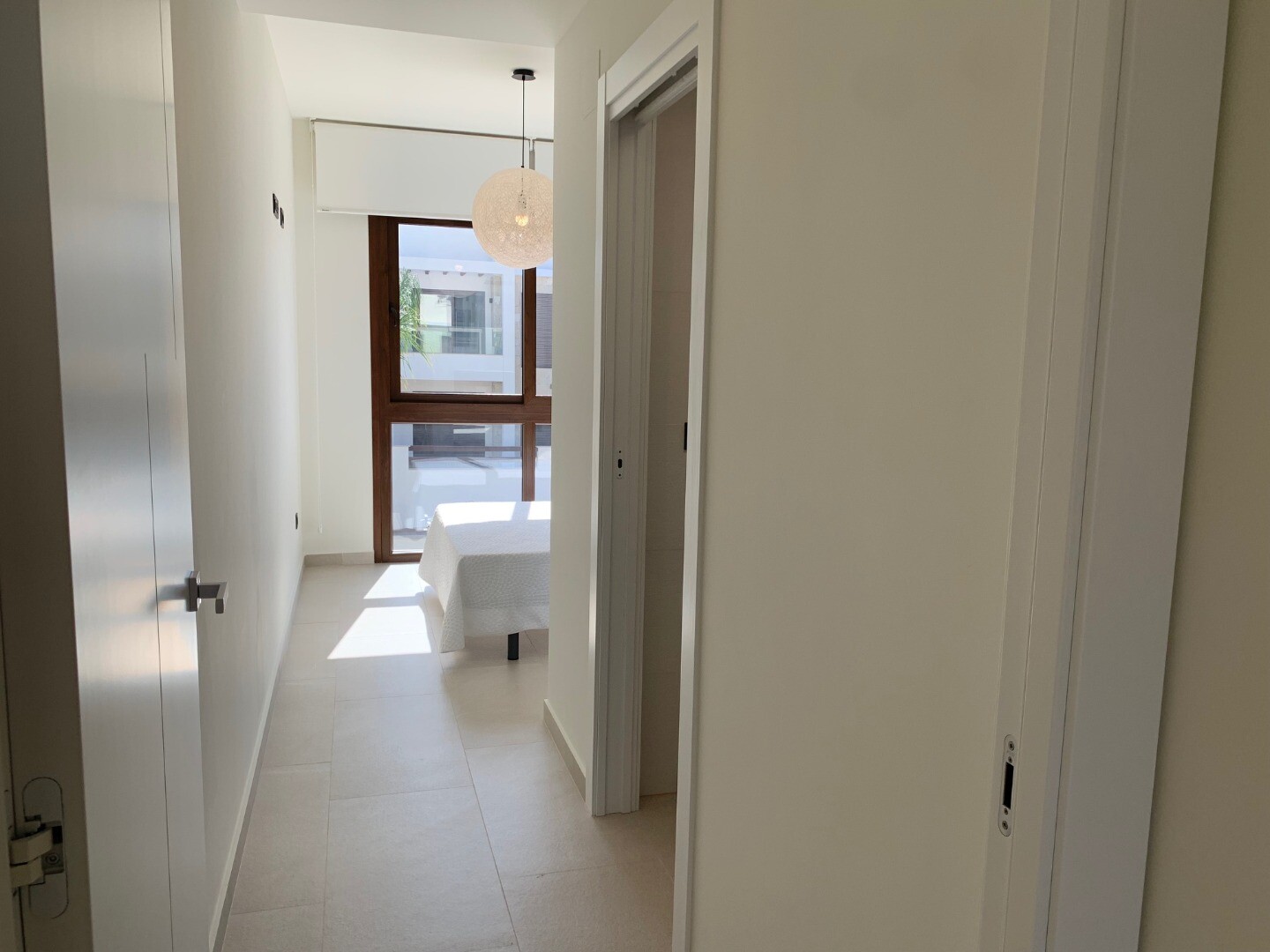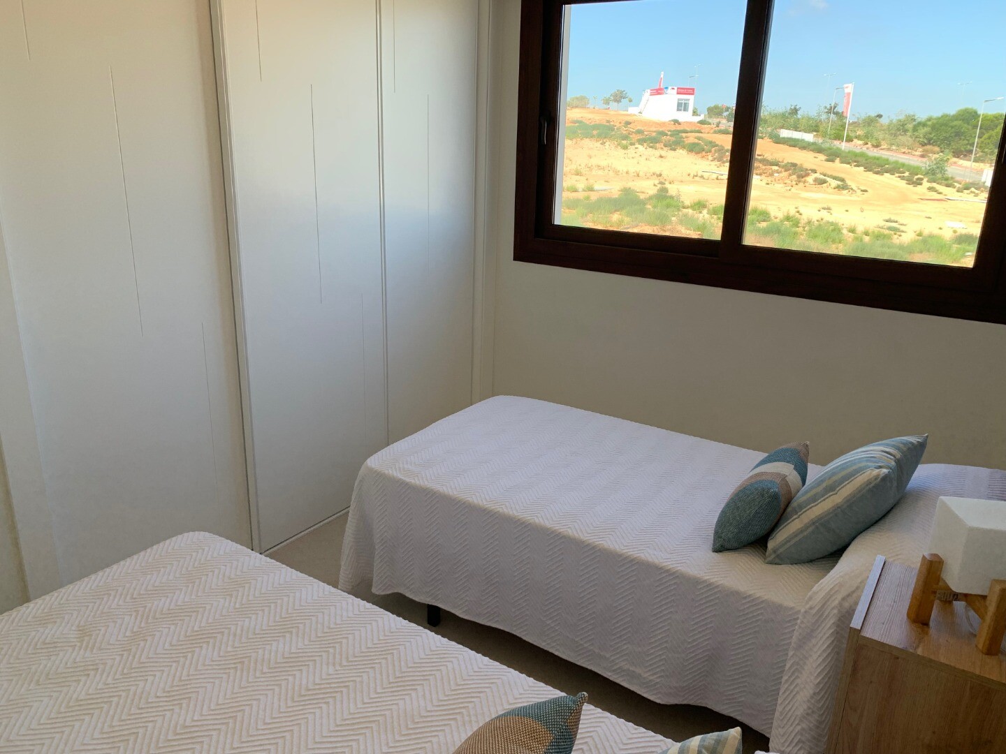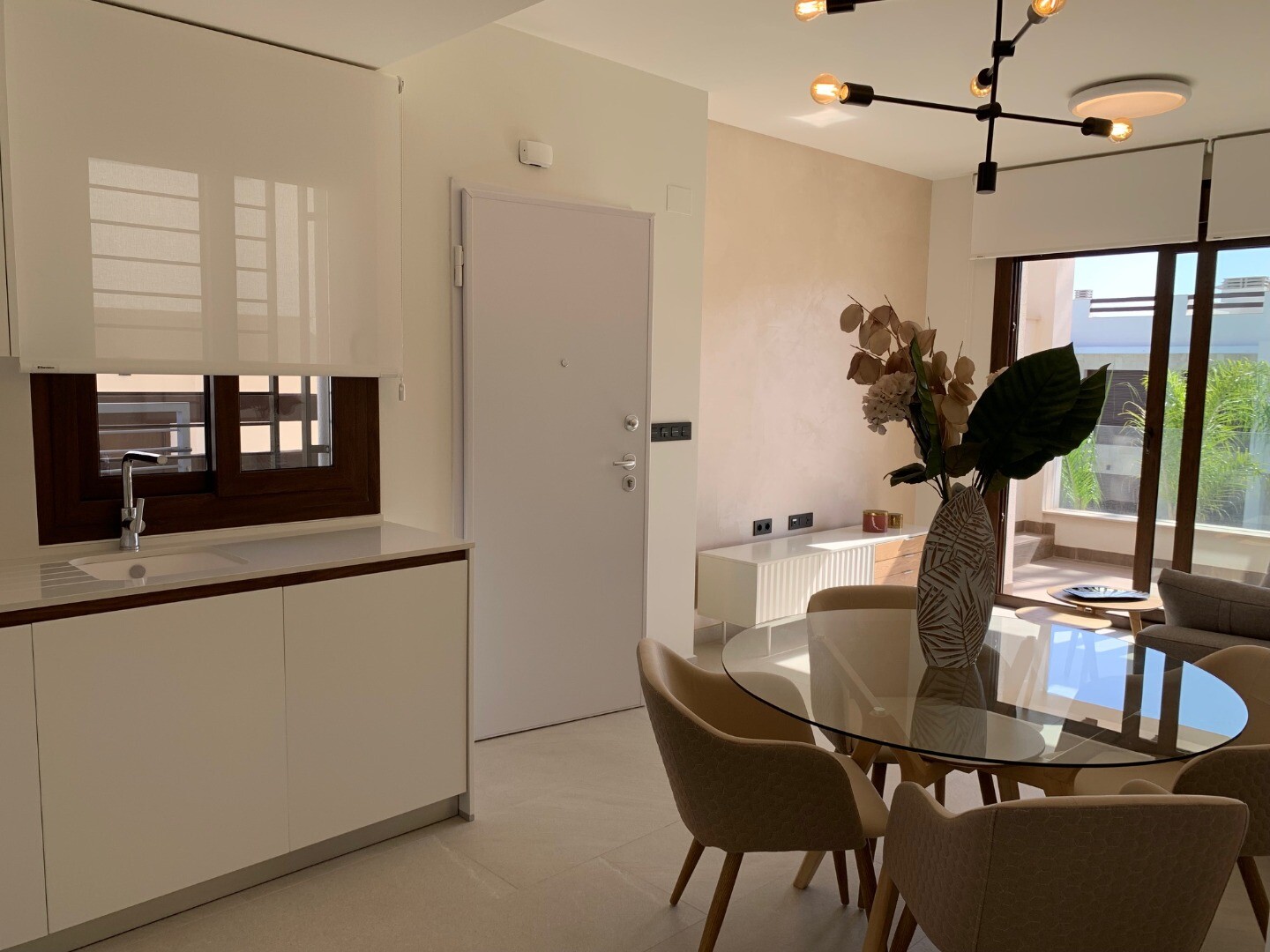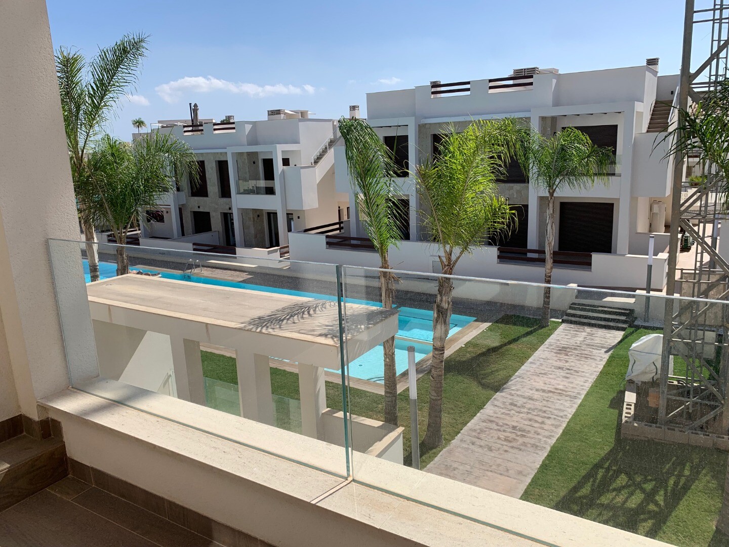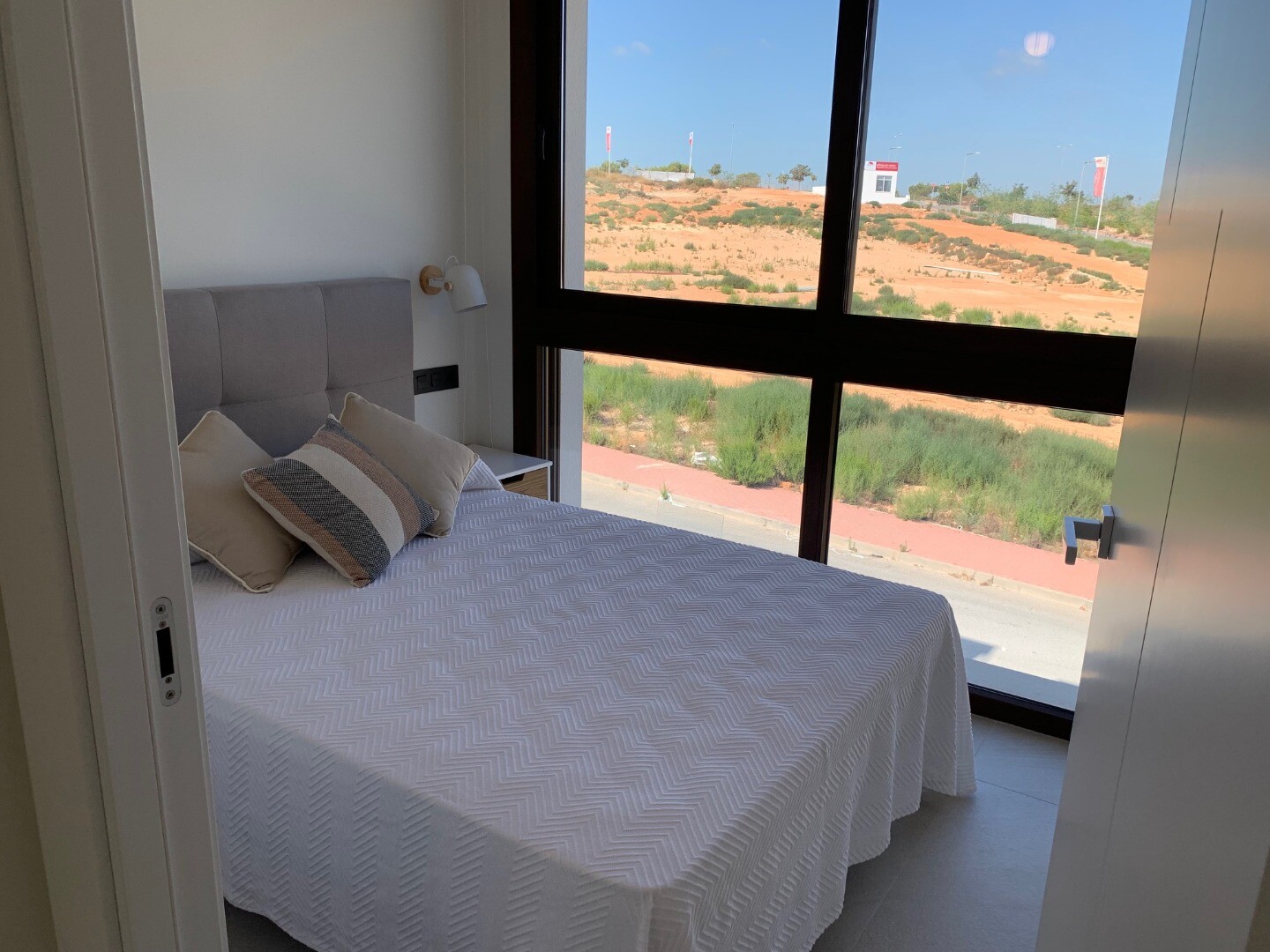 From the solarium you have a beautiful view over the pink salt lake of Torrevieja, as well as a little view of the sea. The balcony overlooks the communal garden and swimming pool.