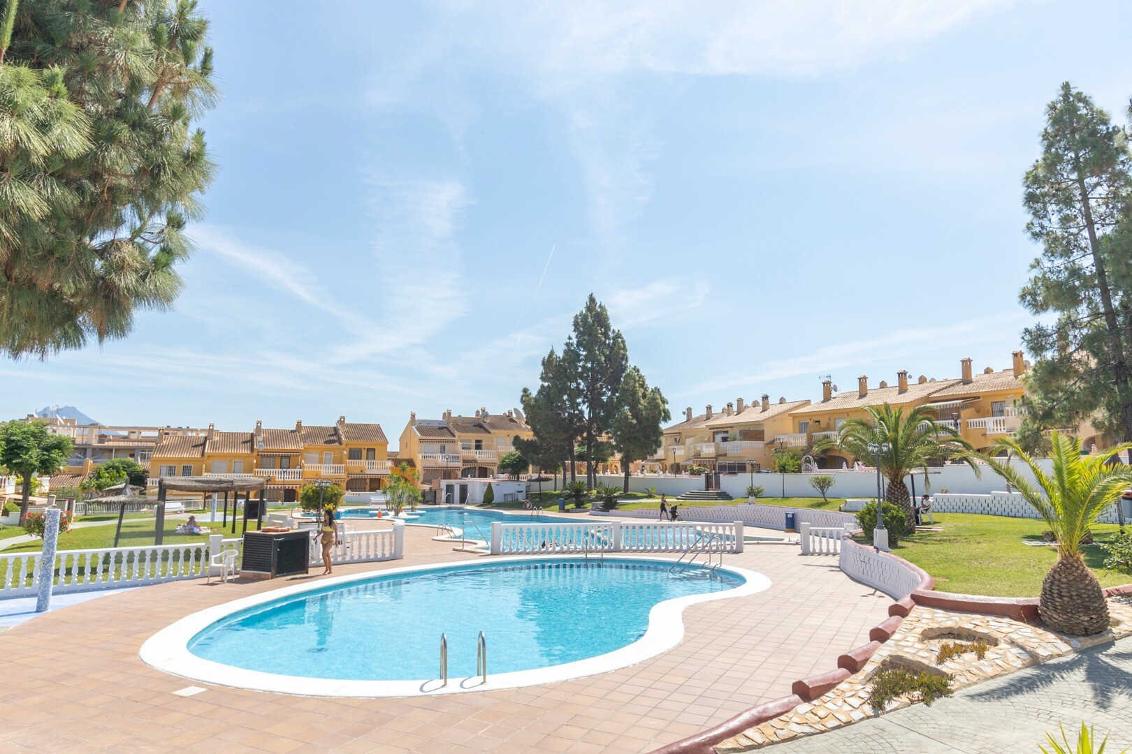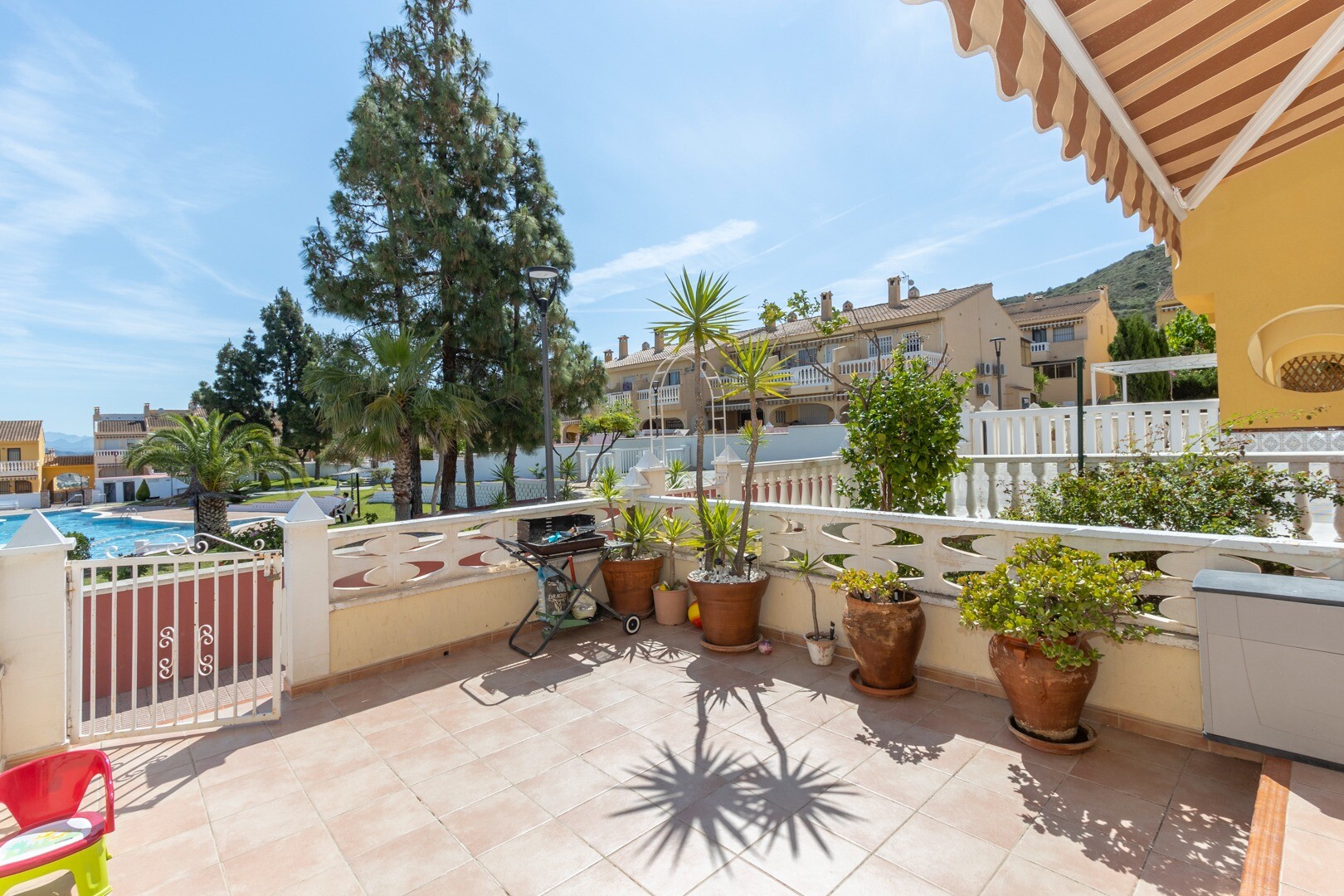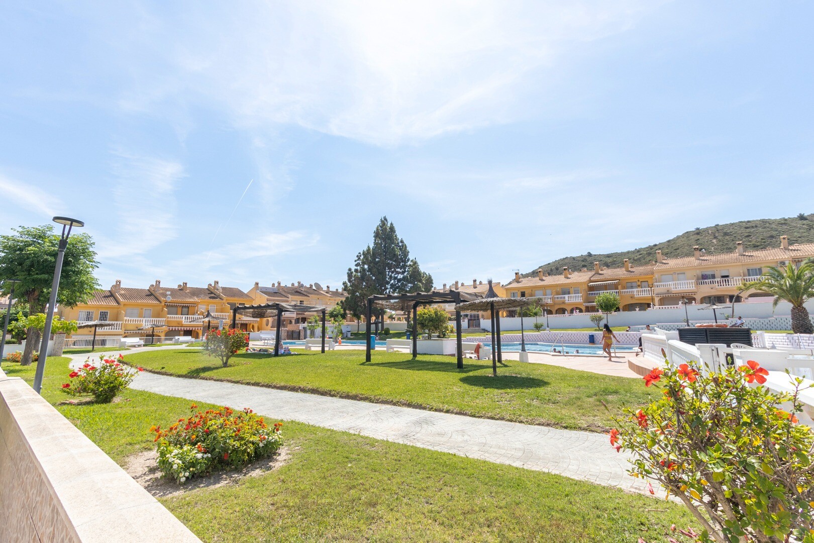 The bungalow includes a full bathroom and a guest toilet, adding practicali...ty to the residence, particularly for families or guests. With two terraces, the property allows you to enjoy outdoor spaces with views of the gardens and the communal pool, creating a relaxing and cozy atmosphere.