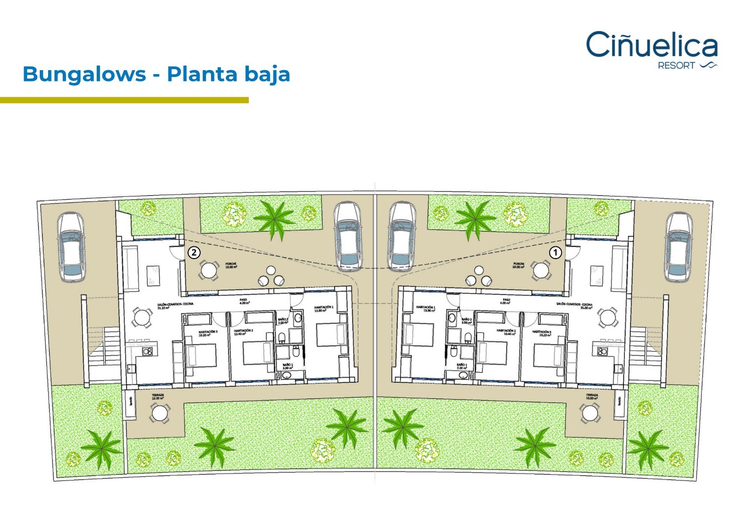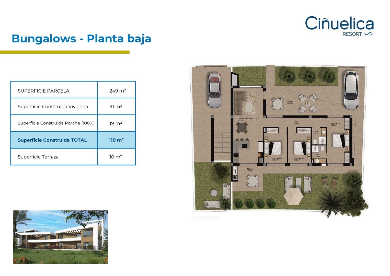 La Cinuelica Resort is a residential complex consisting of 4 apartment blocks with a total of 32 2 bedroom apartments, 32 3 bedroom apartments and 14 bungalows with 3 bedrooms. The apartments are delivered with underground parking space and storage room, kitchen appliances (fridge-freezer-combi, ceramic hob, oven, microwave, dishwasher, washing mac...hine and extractor hood), electric shutters, aerothermic water boiler, pre-installation A/C by means of air ducts and for the roof solariums pre-installation for outdoor kitchen and Jacuzzi. The communal areas include landscaped gardens with 3 swimming pools and 2 heated Jacuzzis, an outdoor gym and a playground. The residential complex is located 1000m from the beach of Punta Prima and 500m from the commercial centres with supermarket, bars, restaurants, ATM, shops etc.