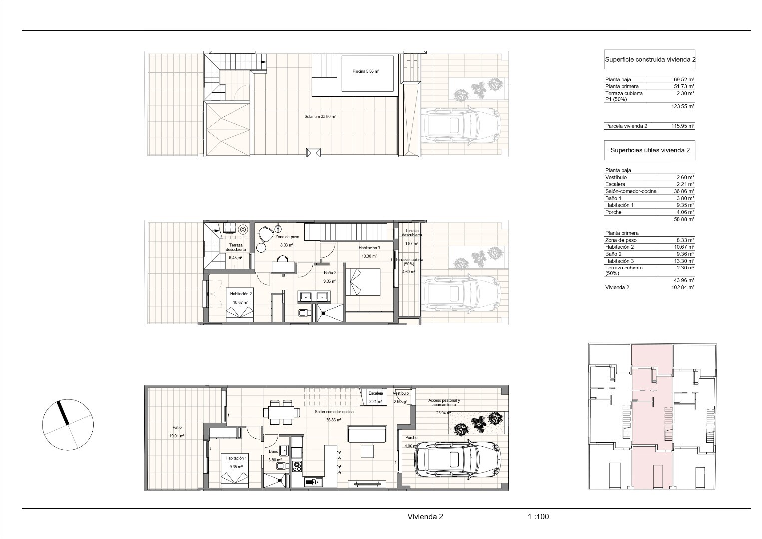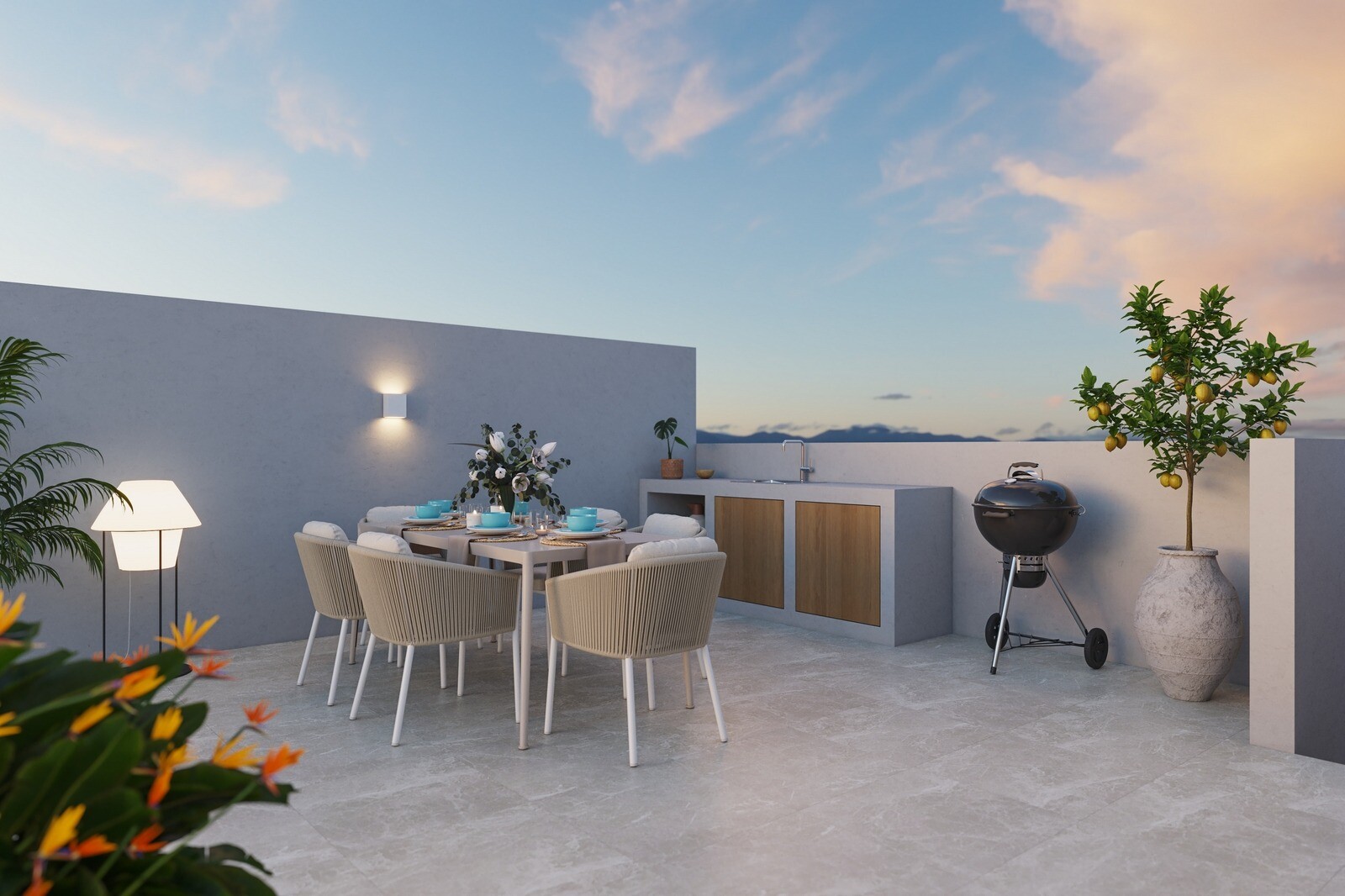Small complex of 3 ready to move into townhouses 100m from the beach in Torre de la Horadada with 3 bedrooms and 2 bathrooms and a heated salt pool on the roof terrace. There is also an installed outdoor kitchen on the roof terrace. The terrace at the front of the building is 30m2 and the patio behind the house is 19m2. The solarium is 33m2. The pr...operty comes with kitchen appliances, interior & exterior lighting and fully finished bathrooms. The airports of Murcia and Alicante can be reached in 40 minutes for Murcia and 50 minutes for Alicante respectively.