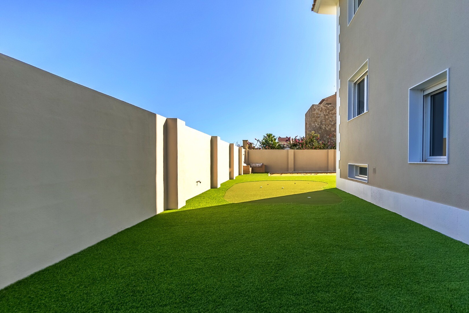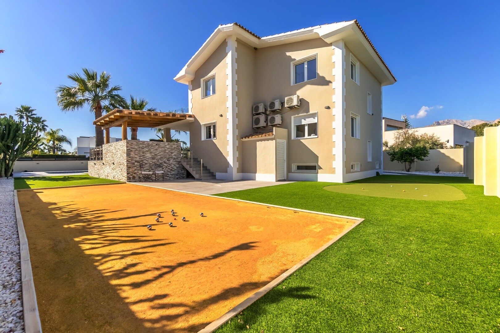 Outside you will find landscaped gardens, outdoor kitchen with barbecue, pergola chill-out area, illuminated 11×5 m swimming pool, pétanque court and private mini-golf green.