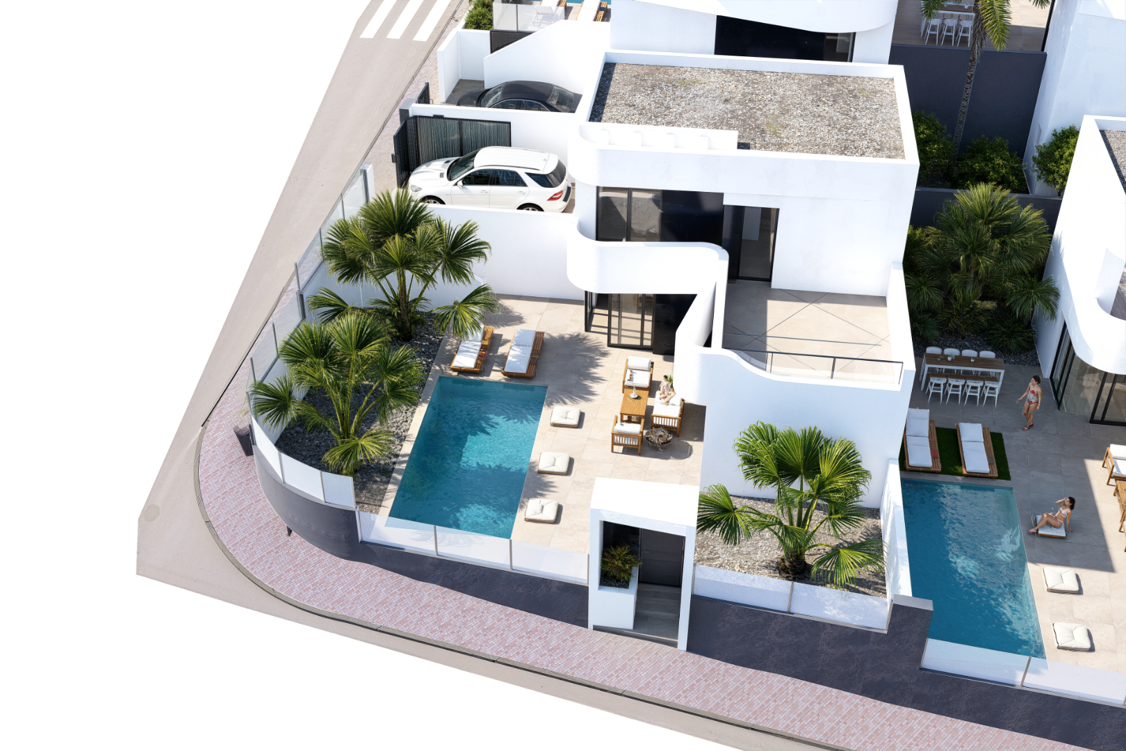 Three house models are offered in different locations. The houses on larger plots have a 7x3m swimming pool. The smaller ones have a 6x3m pool. The houses on the larger plots include a basement as standard, although this is optional for most. The houses have pre-installed air conditioning via ducts.