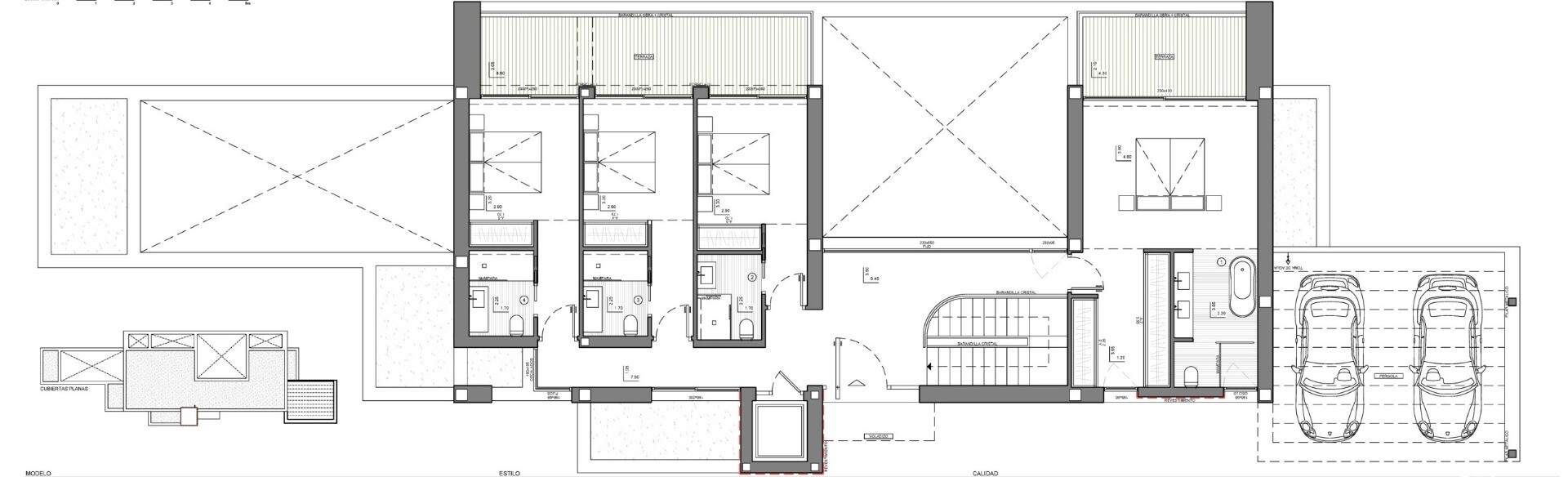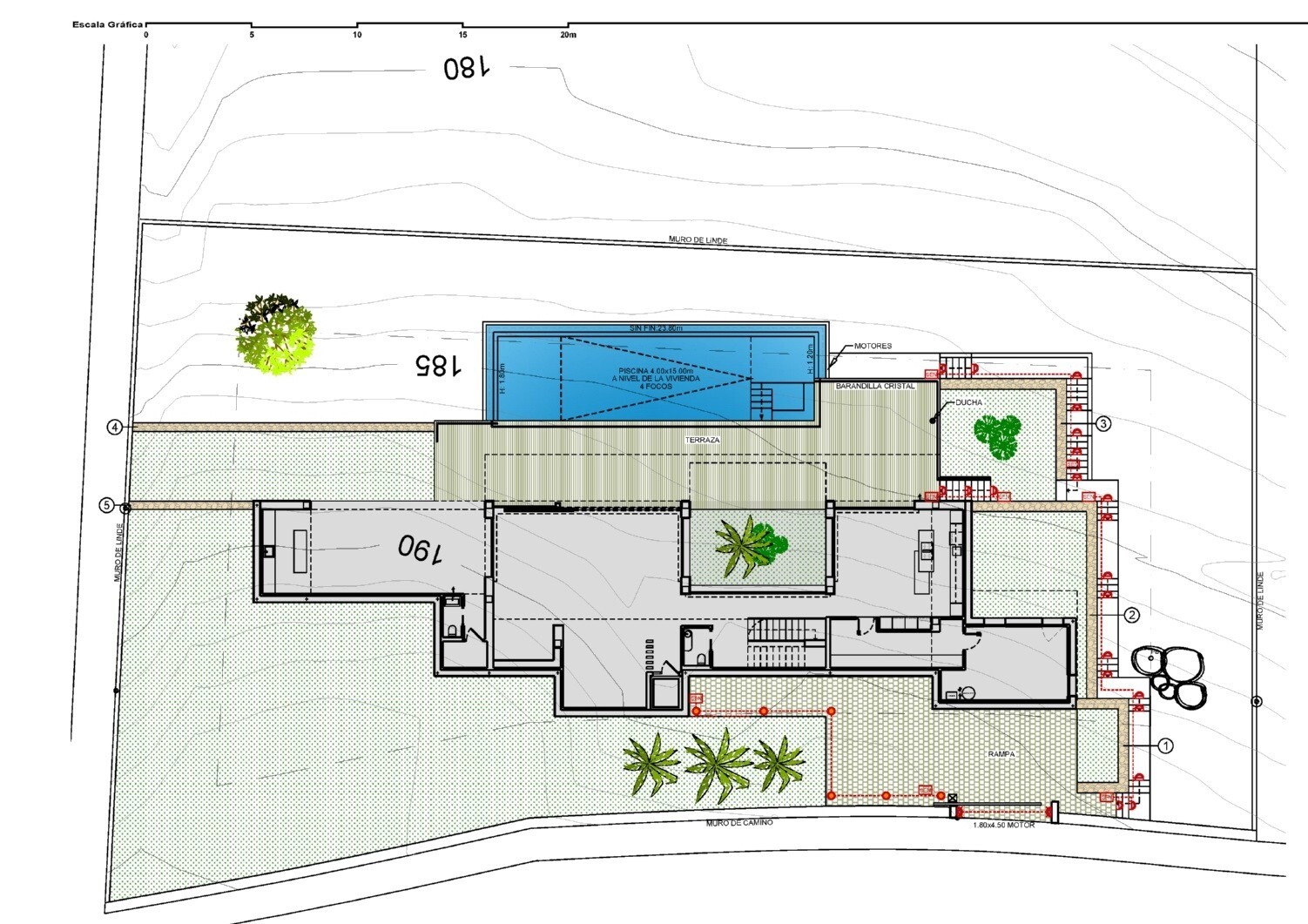 Access to the property is provided from the upper part of the plot, where an elegant pedestrian entrance and a covered garage for two vehicles are located. From this level, both an exterior staircase and an internal lift connect all floors of the villa, ensuring comfort, accessibility and architectural coherence.