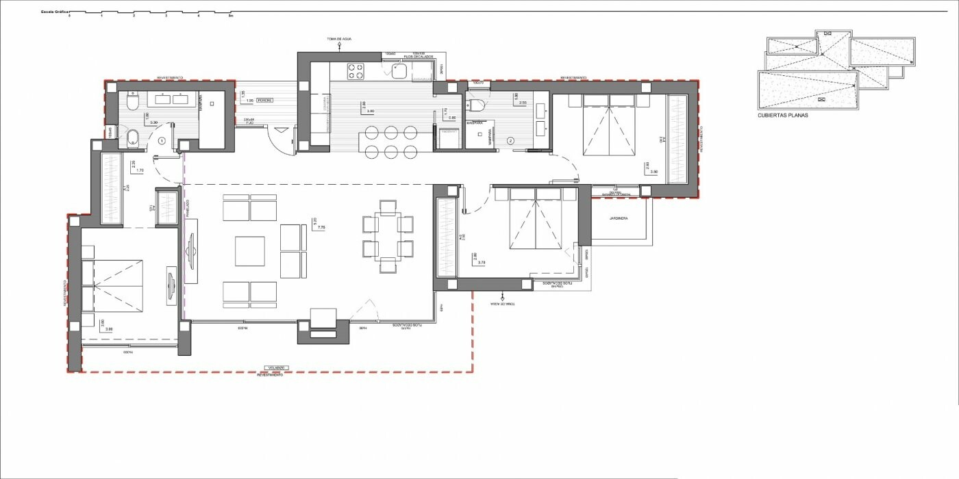 The living-dining room of this house, it´s central feature, communicates directly with the porch and the pool´s terrace. It also communicates with the kitchen by means of a breakfast bar; this layout allows you to still be able to enjoy the sea views from the kitchen.