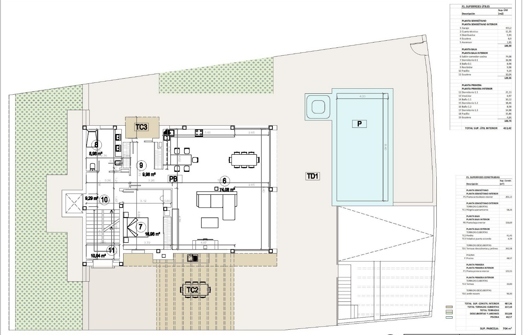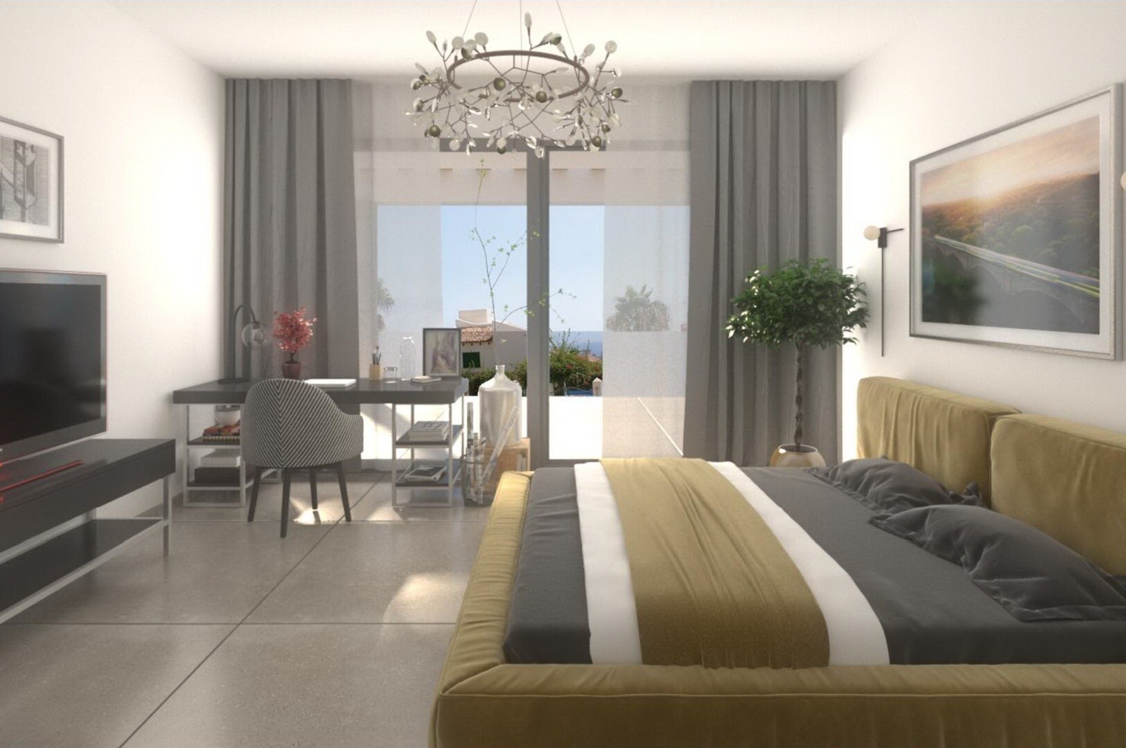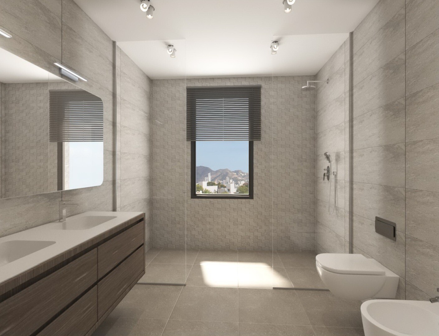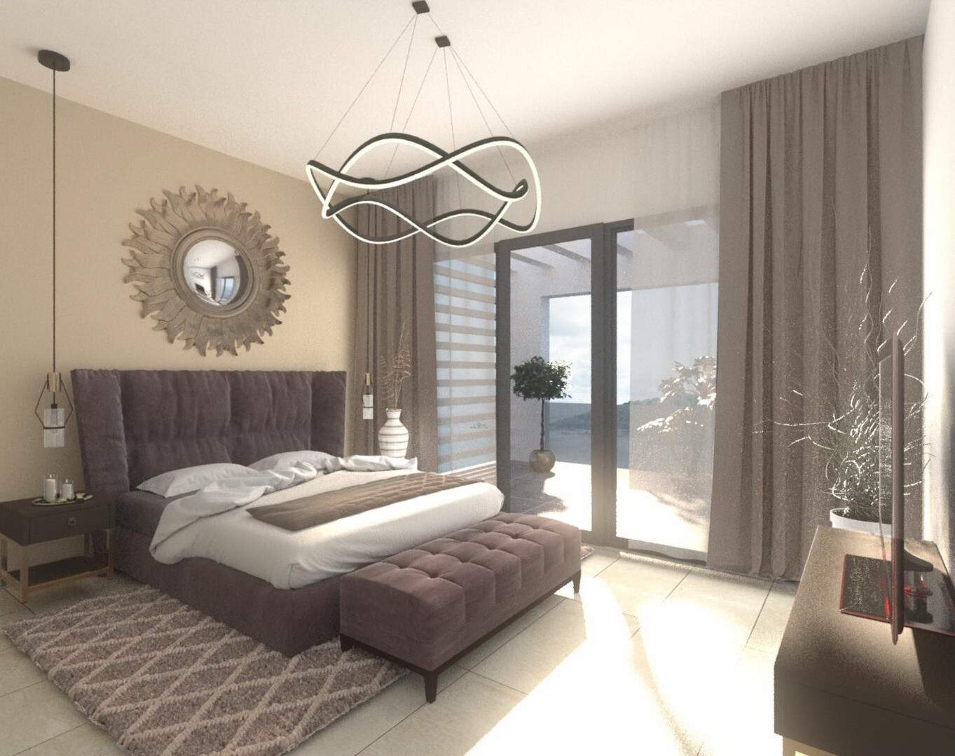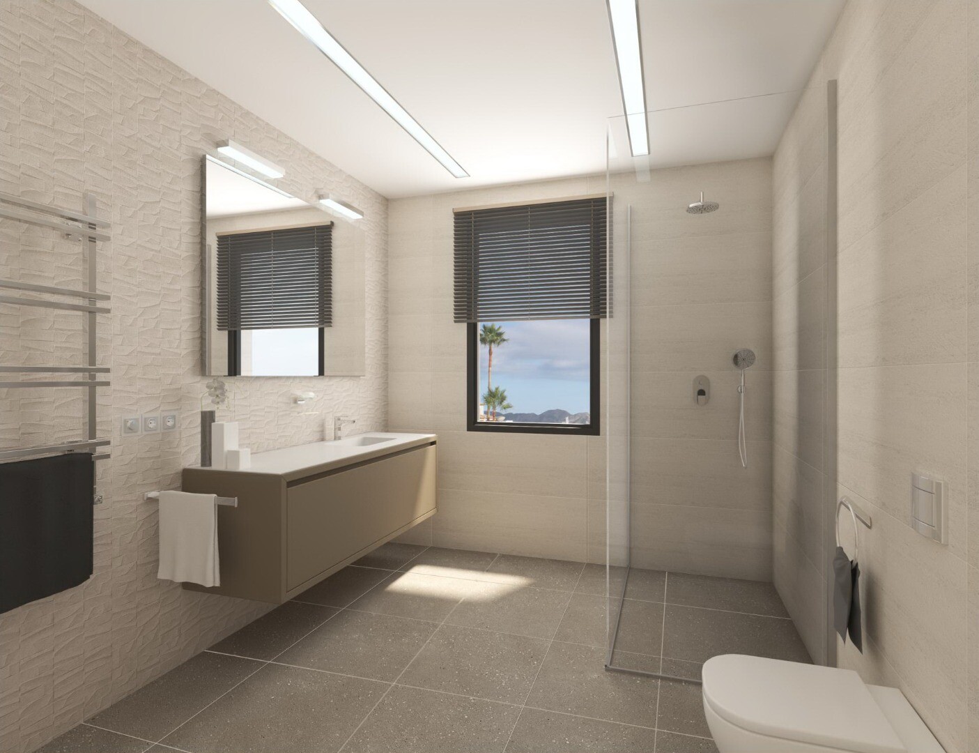 On the first floor there is a master bedroom with a dressing room, private bathroom and the best quality coverings, two bedrooms with fitted wardrobes and a bathroom. Rooms offer panoramic sea views through large floor-to-ceiling windows. In the basement there are 2 outdoor parking spaces, a garage for up to 4 cars, a technical room and two other multipurpose rooms. The air conditioning system works by means of a heat pump, there is underfloor heating throughout the house, ventilation with air renewal, heat recovery system, video intercom, video surveillance, elevator and there is the possibility that the future owner personalize your home with additional services. The villa has a 48.5 m2 swimming pool with a built-in Jacuzzi. The entire lighting installation in the house uses LED luminaires, both inside and outside. The profiles of the aluminum carpentry is Cortizo type or similar (color to choose).