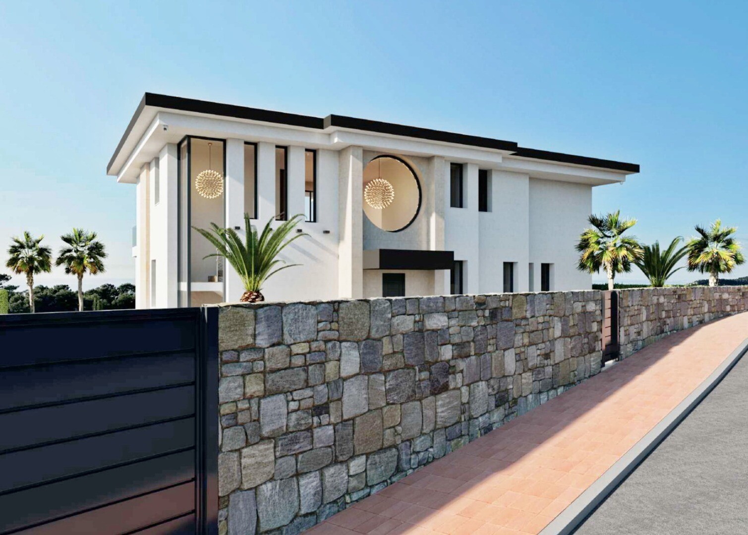 The villas have 4 bedrooms, 5 bathrooms, 2 laundry rooms, and an open-plan living-dining-kitchen area. Outside, there is a covered porch, a pool with sea views, large gardens, and 2 terraces on the first floor.