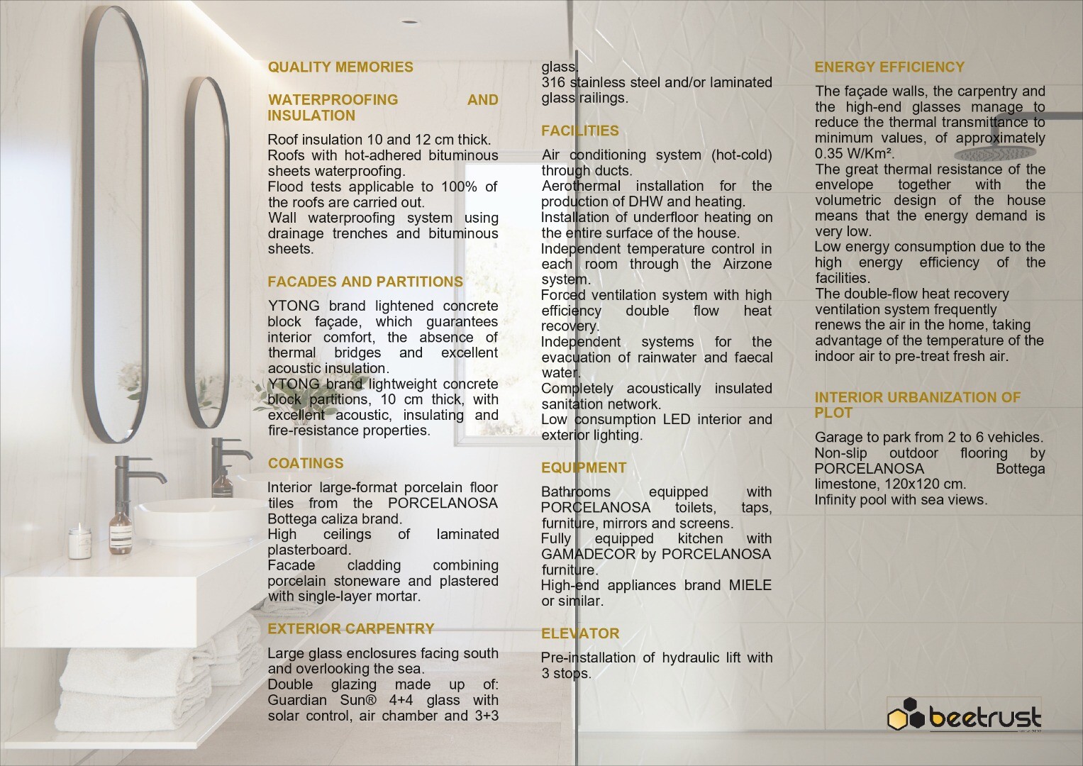 Only the best quality materials and exclusive design are used in these homes. The feeling inside is very spacious thanks to the ...windows facing the sea and the high ceilings, with two double-height spaces in the hall and the living-dining room which allows the free flow of natural light throughout the villa.