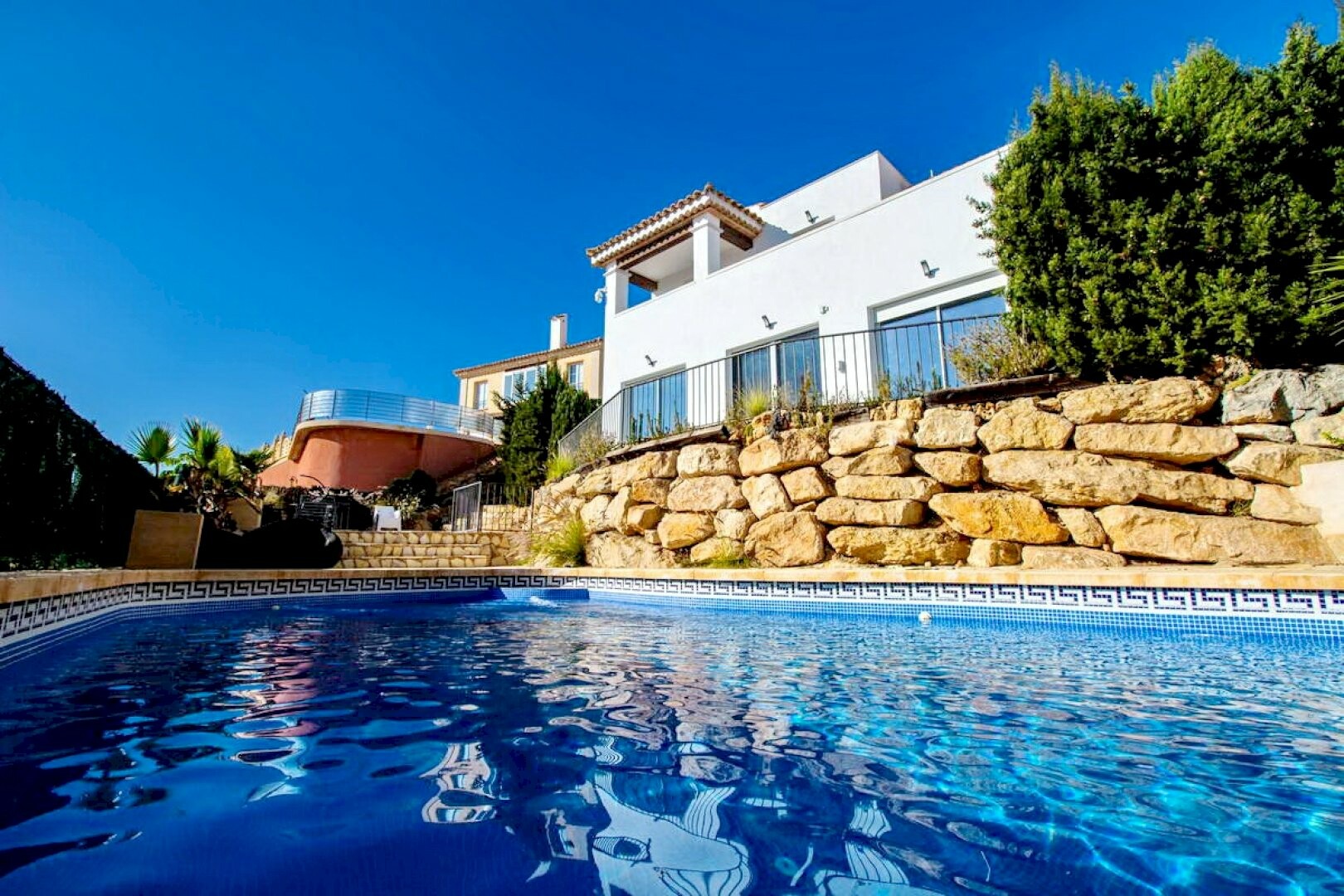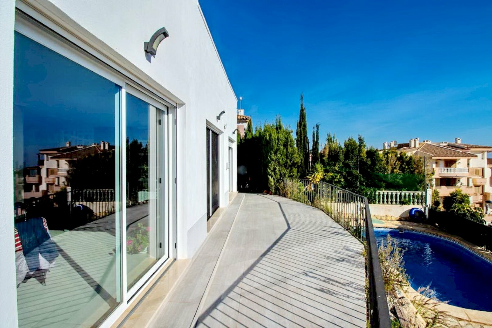 Spectacular Design Villa just 5 minutes from the beach of Cala de Finestrat. It consists of: The ground floor consists of One living room, open kitchen, one bedroom, a gym and a bathroom. The First Floor consists of One bedroom with dressing room (en-suite), Two double bedrooms and two full bathrooms. It also has a pool, fruit trees, two large outd...oor storage rooms, home automation, piped music, Multicine System in all rooms and surveillance system. Housing located on a plot of 463 m2