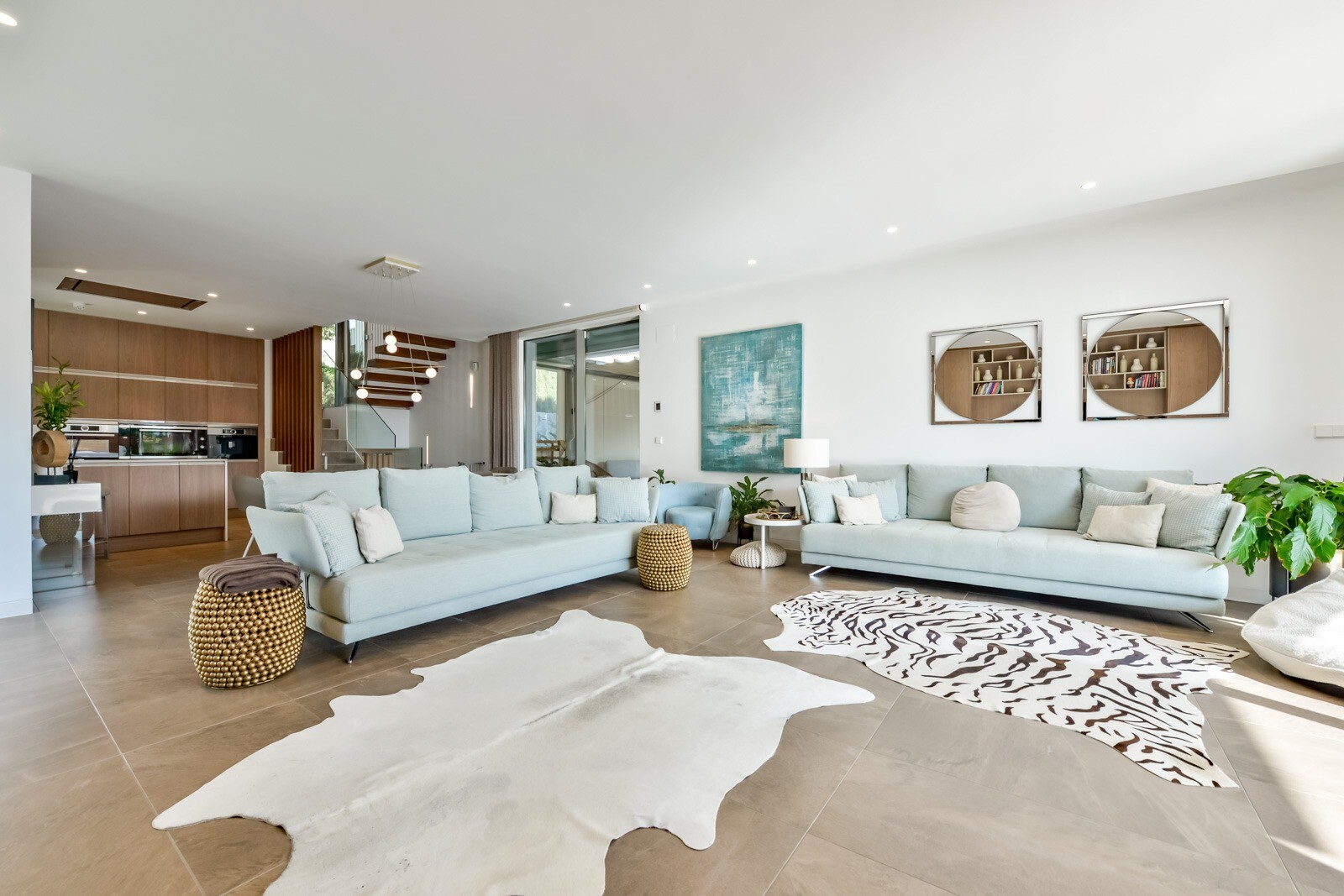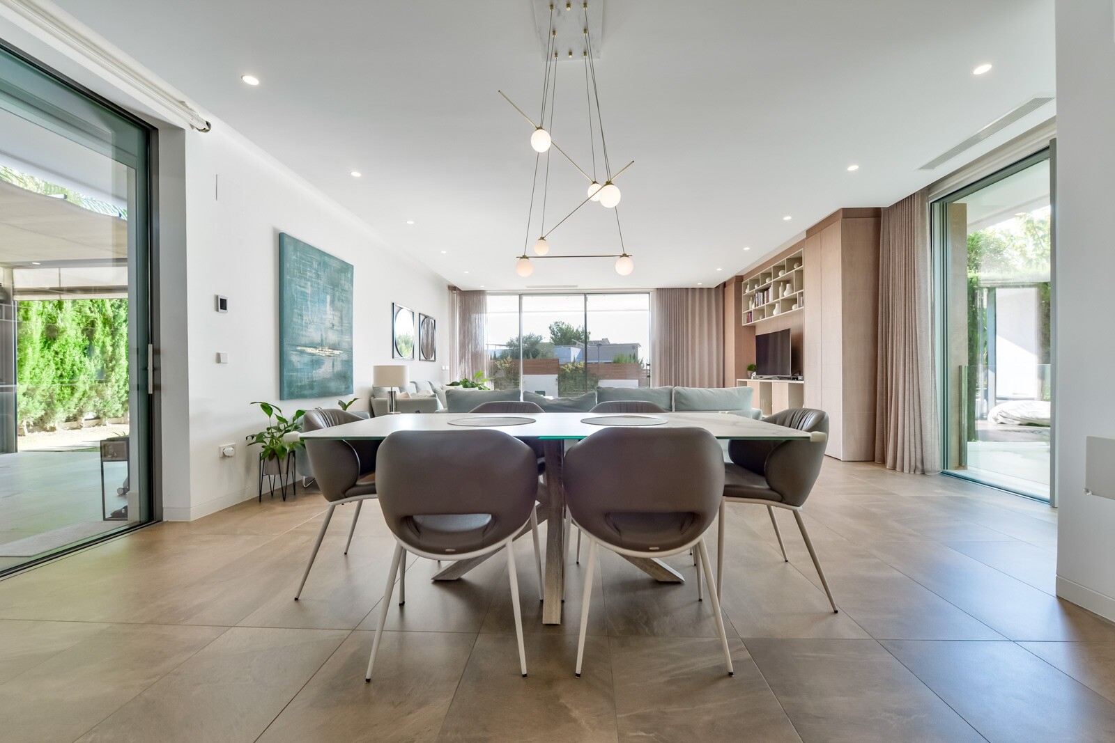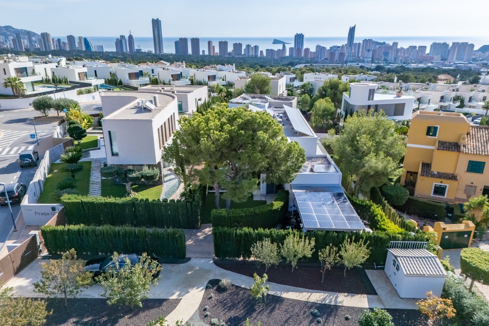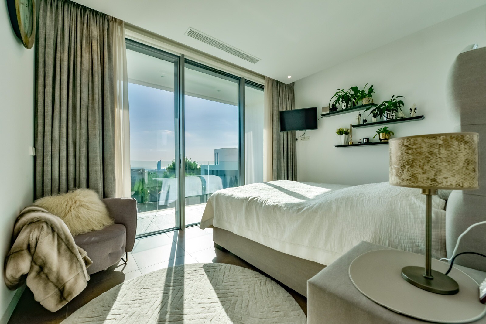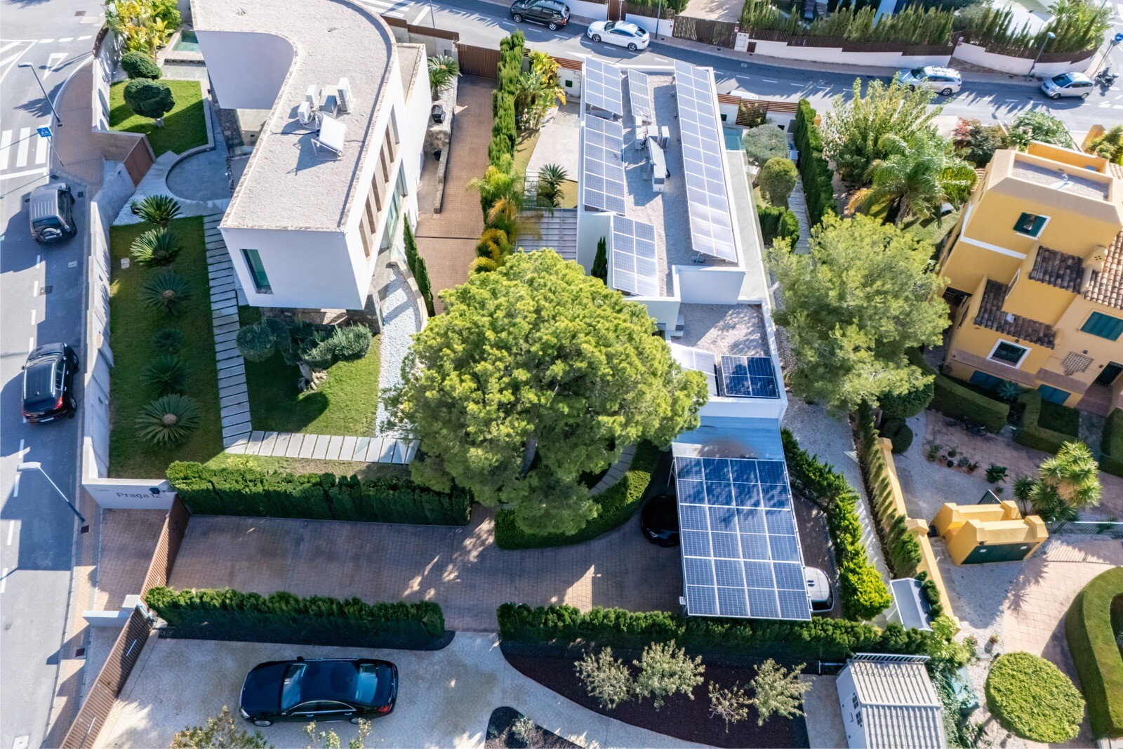 A magnificent house in a prestigious urbanization with absolutely everything to live or relax in a privileged location. The 800 m2 plot is accessed through a covered parking lot and garage. There is the possibility of purchasing the villa with a 700 m2 plot, with an adjoining garden with fruit trees and a children's sports center, in which case the... villa would cost 1,820,000 euros. The 379 m2 house has: On the ground floor. a large living room with direct access to the pool and a large open-plan kitchen, comfortable for the owners of the house. From this floor there is access to the pool and the covered summer terrace/kitchen, covered on the sides with fabric, in winter it becomes a cozy place, it can also be used for barbecues. Going up the internal stairs to the upper floor we see the master bedroom with open sea views, equipped with an en-suite bathroom, dressing room and private terrace. There are also 2 more bedrooms with built-in wardrobes, a large terrace and a bathroom. The basement has natural light that floods the English patio and the stairs leading to the plot, there are two large bedrooms and space for a gym with sauna and bathroom. The house has home automation, underfloor heating, ducted air conditioning and automatic blinds. There are solar panels on the roof of the house and in the parking lot.