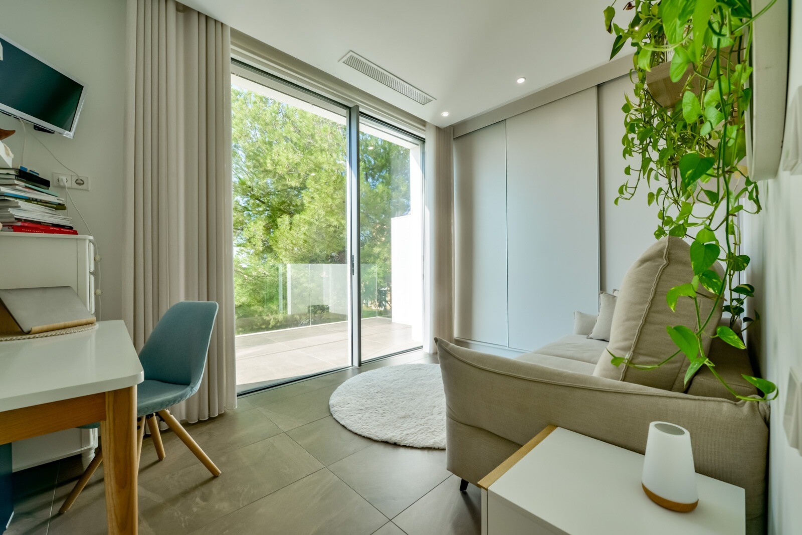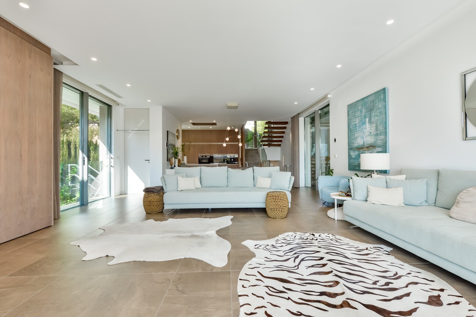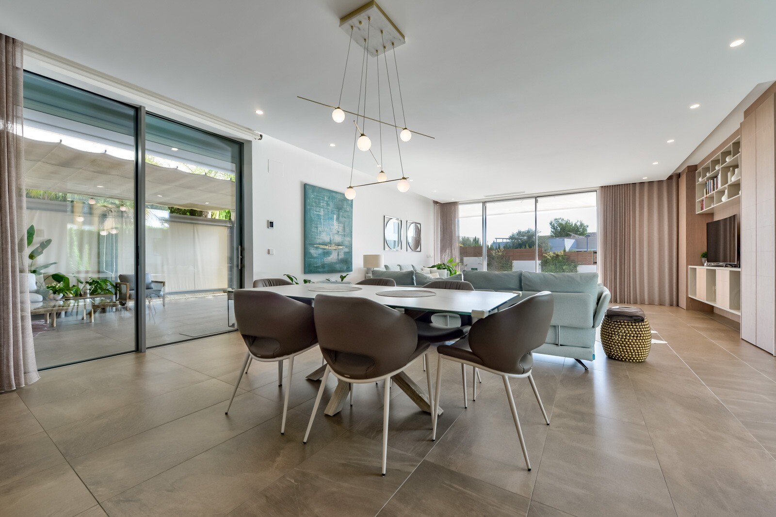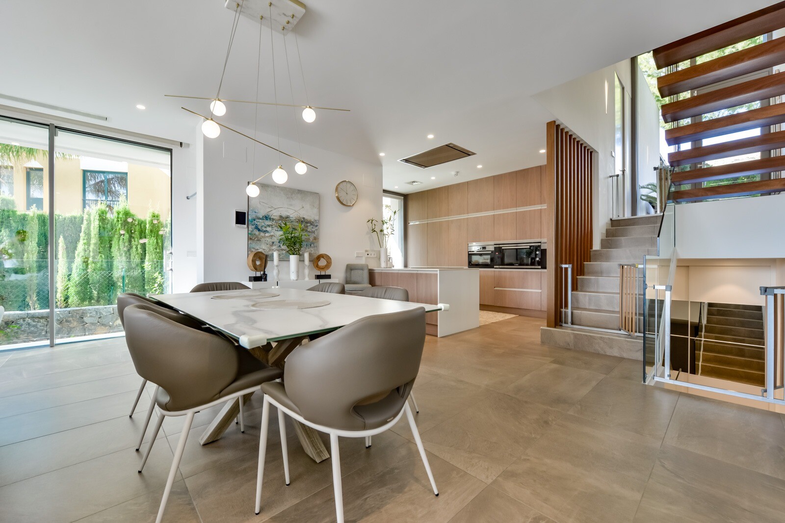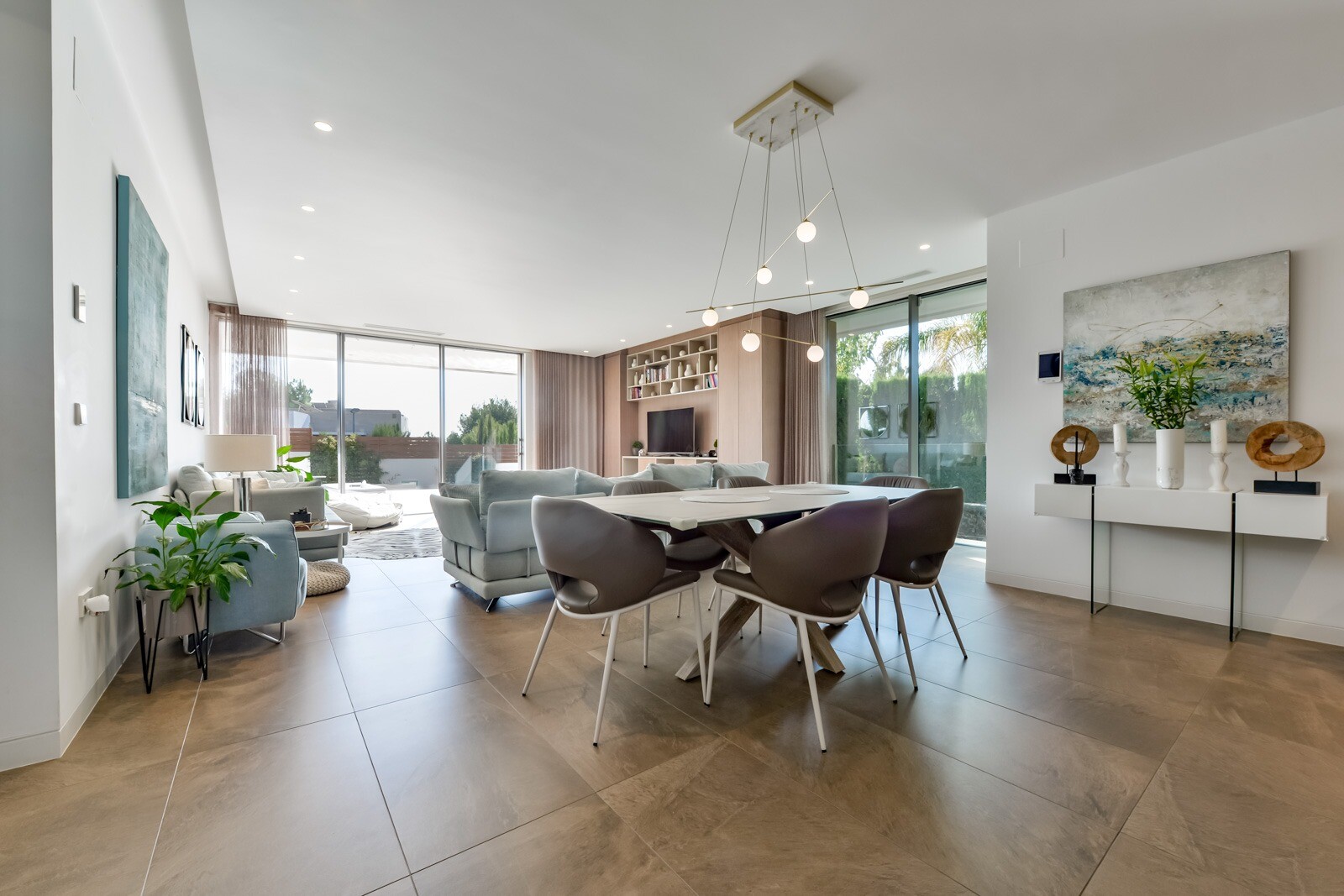 A magnificent house in a prestigious urbanization with absolutely everything to live or relax in a privileged location. The 800 m2 plot is accessed through a covered parking lot and garage. There is the possibility of purchasing the villa with a 700 m2 plot, with an adjoining garden with fruit trees and a children's sports center, in which case the... villa would cost 1,820,000 euros. The 379 m2 house has: On the ground floor. a large living room with direct access to the pool and a large open-plan kitchen, comfortable for the owners of the house. From this floor there is access to the pool and the covered summer terrace/kitchen, covered on the sides with fabric, in winter it becomes a cozy place, it can also be used for barbecues. Going up the internal stairs to the upper floor we see the master bedroom with open sea views, equipped with an en-suite bathroom, dressing room and private terrace. There are also 2 more bedrooms with built-in wardrobes, a large terrace and a bathroom. The basement has natural light that floods the English patio and the stairs leading to the plot, there are two large bedrooms and space for a gym with sauna and bathroom. The house has home automation, underfloor heating, ducted air conditioning and automatic blinds. There are solar panels on the roof of the house and in the parking lot.