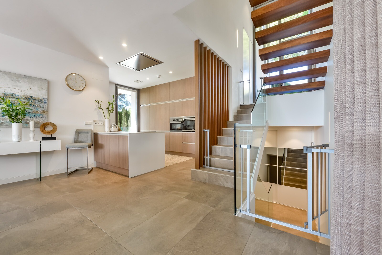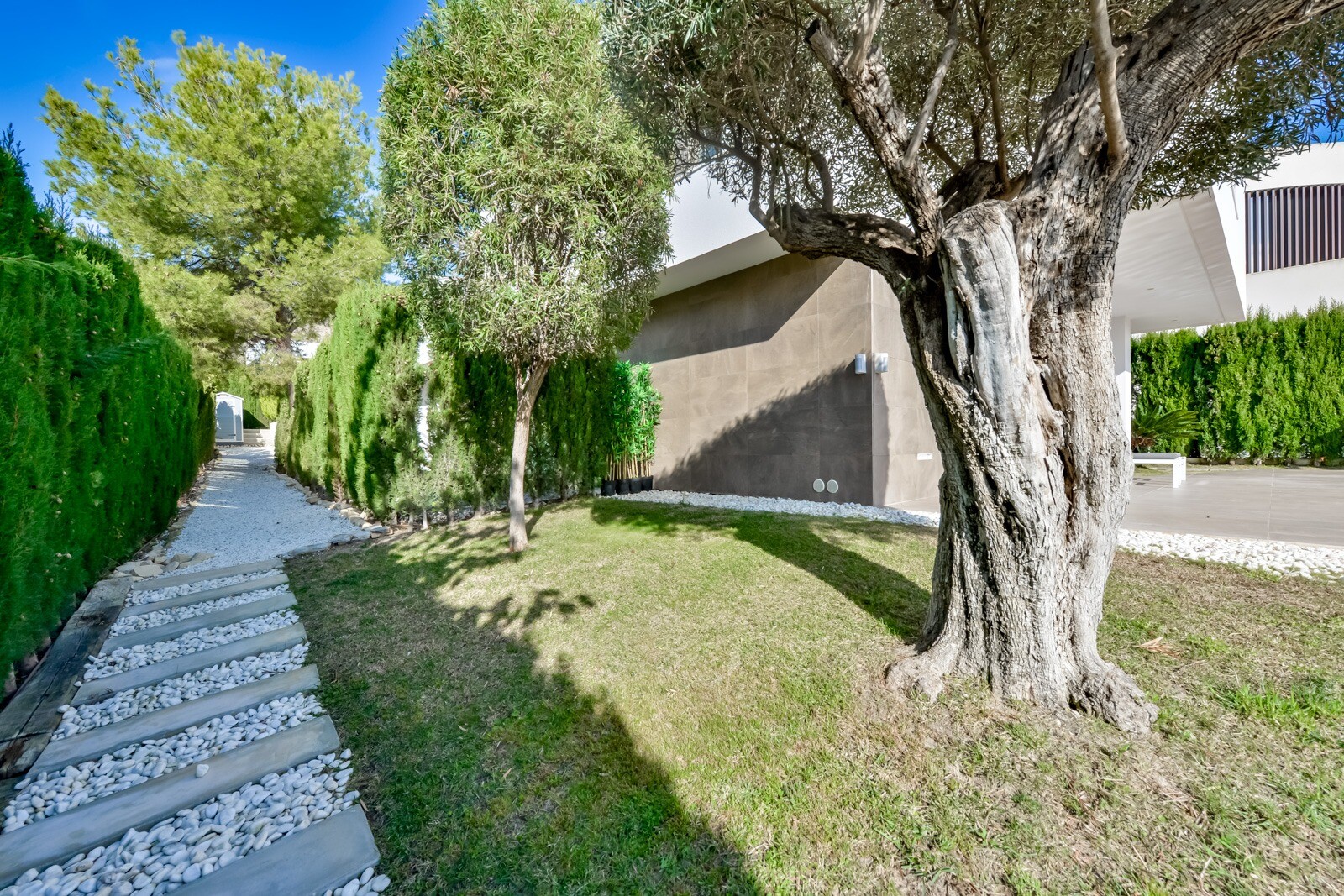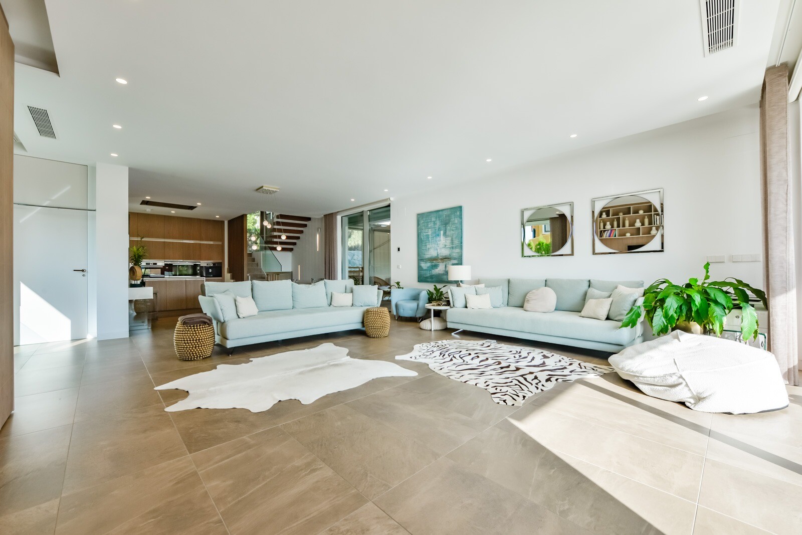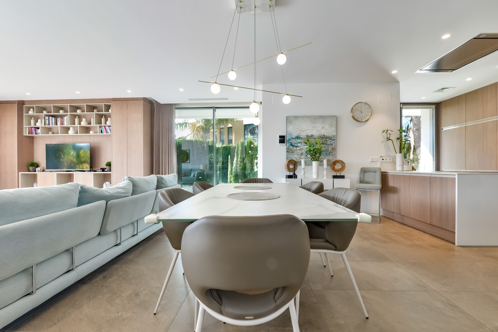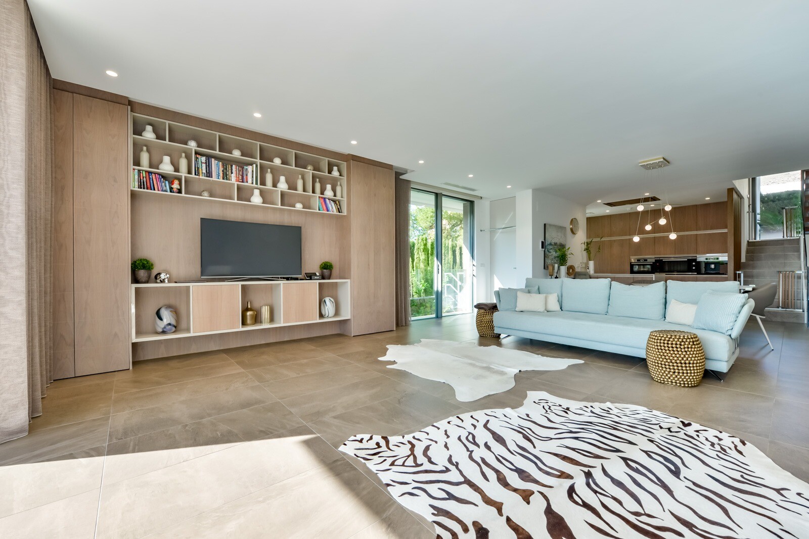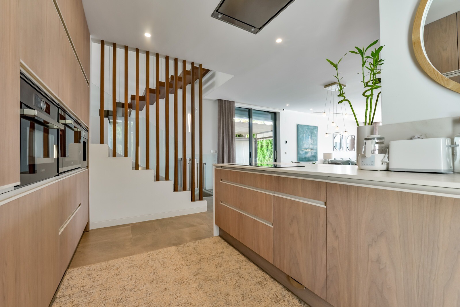 A magnificent house in a prestigious urbanization with absolutely everything to live or relax in a privileged location. The 800 m2 plot is accessed through a covered parking lot and garage. There is the possibility of purchasing the villa with a 700 m2 plot, with an adjoining garden with fruit trees and a children's sports center, in which case the... villa would cost 1,820,000 euros. The 379 m2 house has: On the ground floor. a large living room with direct access to the pool and a large open-plan kitchen, comfortable for the owners of the house. From this floor there is access to the pool and the covered summer terrace/kitchen, covered on the sides with fabric, in winter it becomes a cozy place, it can also be used for barbecues. Going up the internal stairs to the upper floor we see the master bedroom with open sea views, equipped with an en-suite bathroom, dressing room and private terrace. There are also 2 more bedrooms with built-in wardrobes, a large terrace and a bathroom. The basement has natural light that floods the English patio and the stairs leading to the plot, there are two large bedrooms and space for a gym with sauna and bathroom. The house has home automation, underfloor heating, ducted air conditioning and automatic blinds. There are solar panels on the roof of the house and in the parking lot.