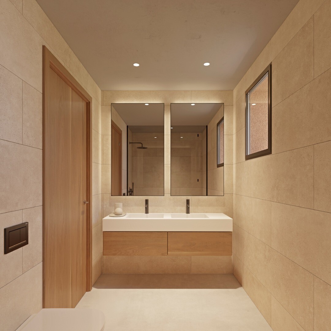 This villa offers a cosy interior, where wood takes a leading role. This design is distinguished by clearly separating the rest areas from the more active areas of the house. On the upper floor are the 3 bedrooms, while on the ground floor are the kitchen and the living-dining room, which are complemented by the outdoor areas. These areas, such as the porch with outdoor dining area, the terrace, the swimming pool and the gardens with native species, are ideal for enjoying the Mediterranean climate practically all year round, connecting the house with nature.