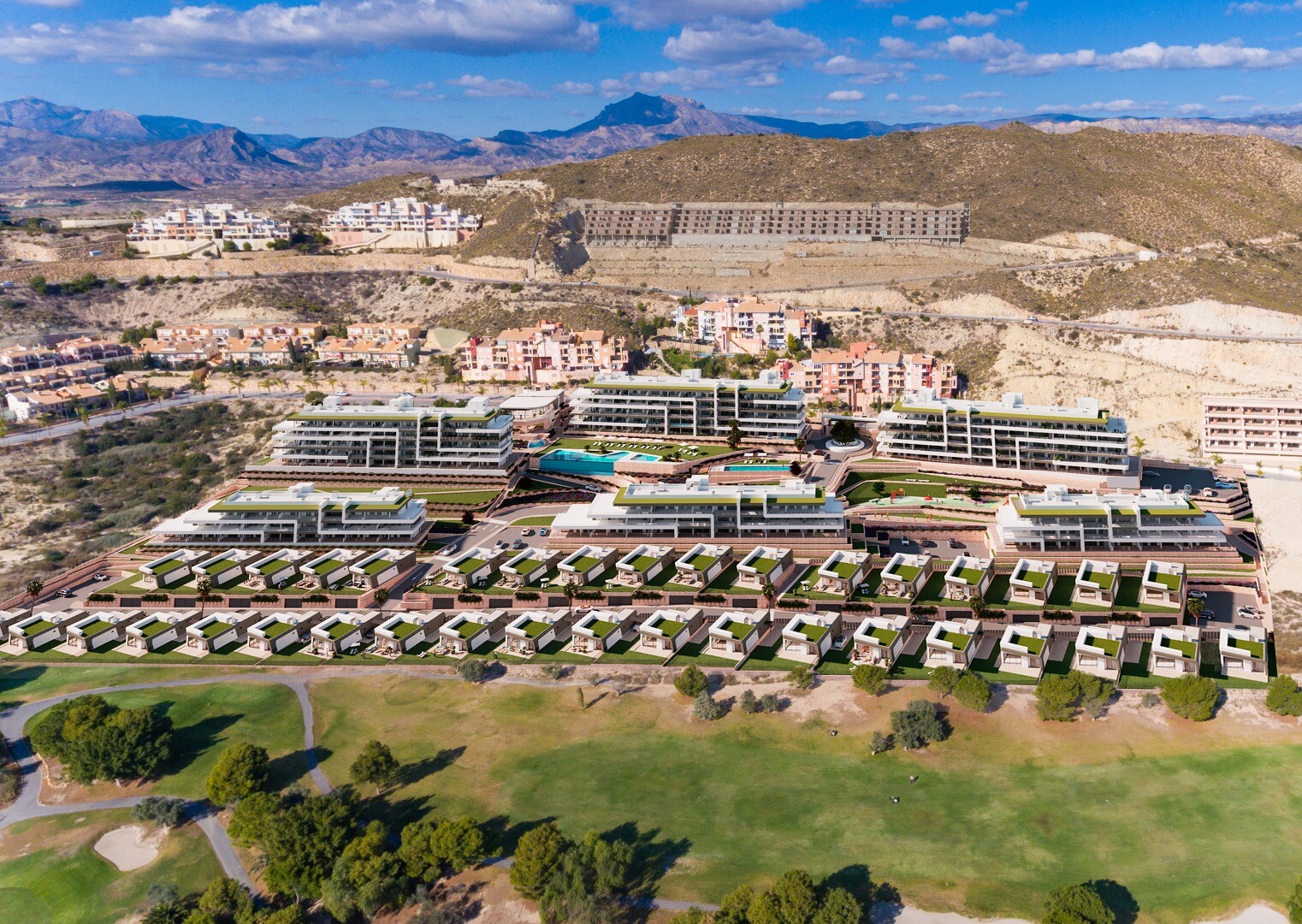 From 550.000 Euros. 3 bedroom villas with basement and avant-garde design, with southeast orientation to make the most of the sun, and large terrace overlooking the Mediterranean Sea and the golf course. In addition, the complex will have a swimming pool, private social club, children's play area and recreational areas where you can enjoy your leis...ure time. The international airport Elche - Alicante Miguel Hernández is only 20 minutes away, the well-known beaches of El Campello are only 10 minutes away and the city of Alicante with a wide variety of services and leisure areas is only 15 minutes away. The development fuses the concepts of sea, life, avant-garde architecture and golf to create a style with a unique character. Possibility of private swimming pool (optional). Contact us for more information!