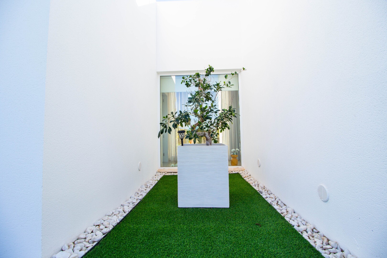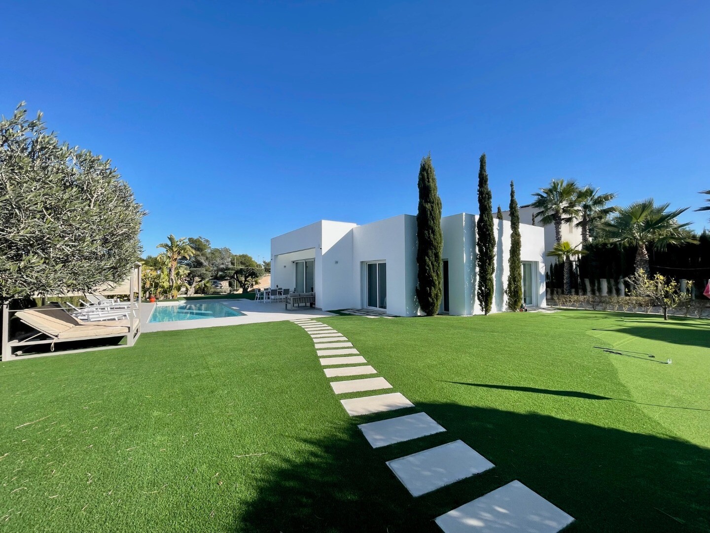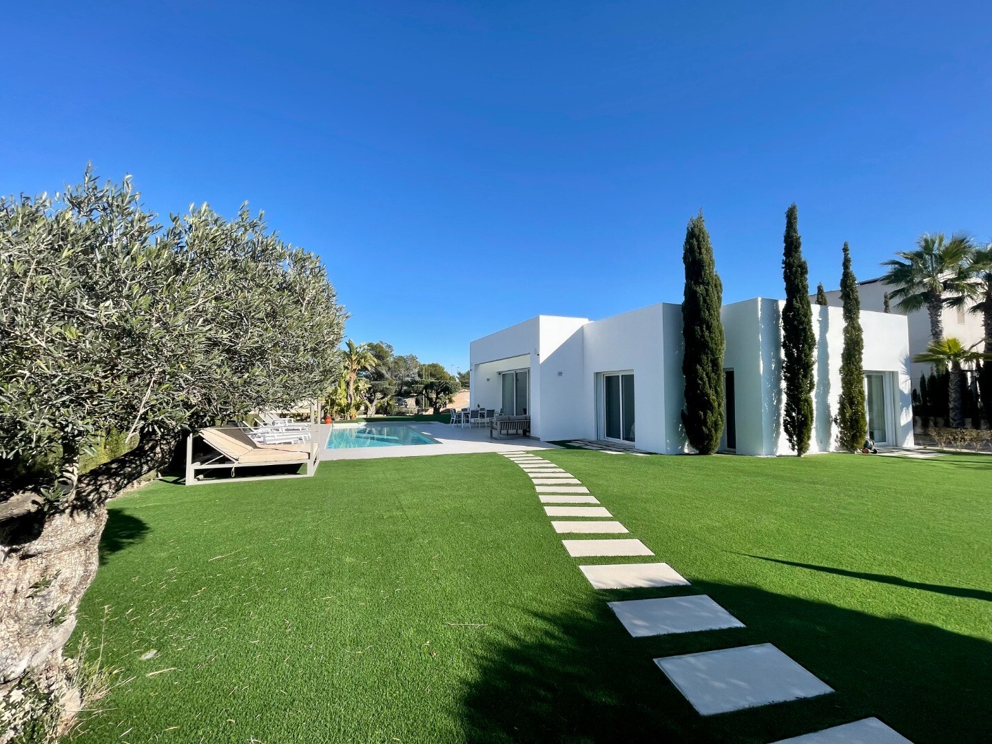 The house is located in the exclusive and prestigious community of ALMENDRO, it has a large plot of 1200 m² in which we find: a house with 140 m² of built area, an open terrace of 37 m2, a large outdoor storage room, barbecue, Balinese-style shower and a private swimming pool with a water surface of 26.95 m², as well as a spectacular and original "...putting green" with artificial grass. It has three bedrooms, three bathrooms, two of them en suite, a fully equipped American kitchen and the use and enjoyment of two outdoor parking spaces with a PVC pergola. It was built in 2017 by the prestigious developer SOMIUM. The distribution on one floor and the large windows maximize integration into the environment and facilitate outdoor living. Designed to enjoy the Mediterranean climate and landscape, this exclusive villa is very unique within the residential complex, both for its avant-garde design and for its high quality standards. The house is delivered fully furnished and decorated, with all high-quality extras (air conditioning, domotics, alarm, underfloor heating....). Due to the design of its homes, the high quality standards of its services and facilities, the preservation of its natural environment and the excellence of its golf course, Las Colinas Golf & Country Club enjoys a prestigious international reputation and has therefore been featured in several editions of recognized international awards.