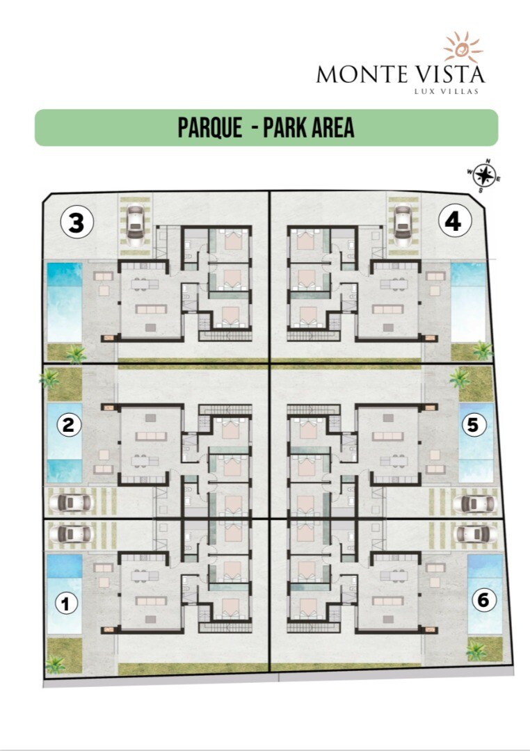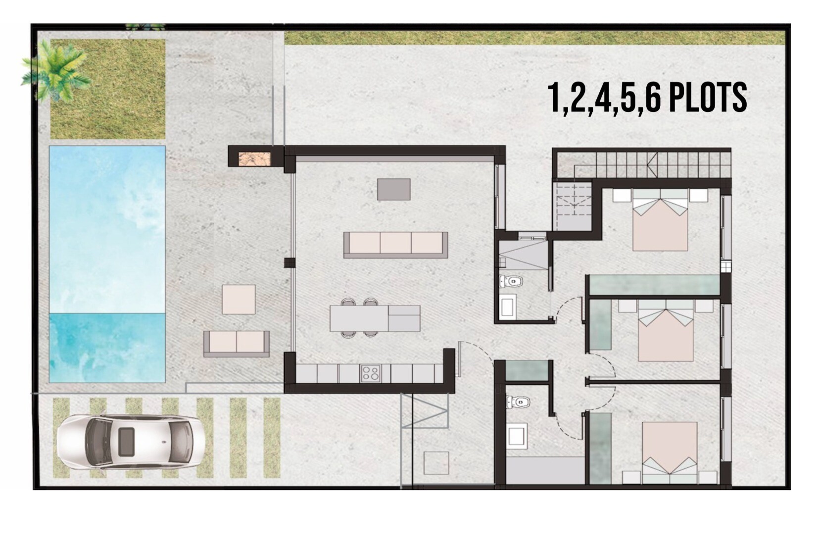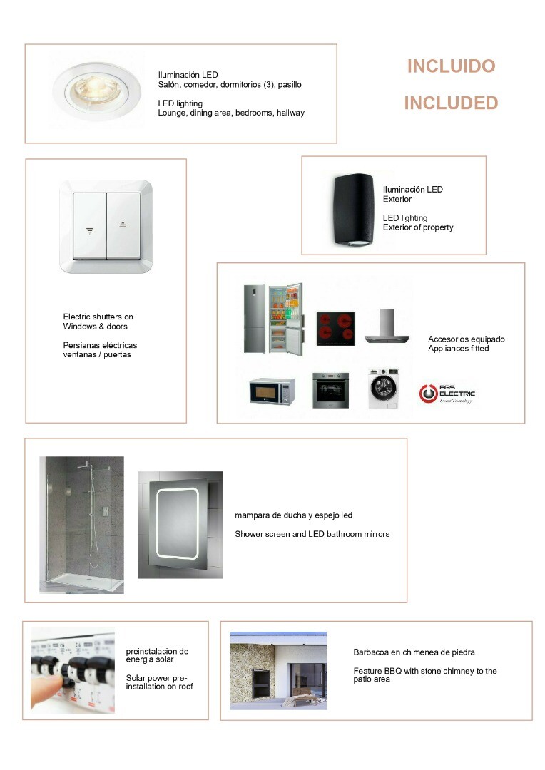 LED lighting installed inside and outside, kitchen appliances (extractor hood, vitroceramic hob, oven, microwave, dishwasher, washing machine, fridge-freezer combi), solarium, electric shutters, swimming pool 6x3 (for corner model 7x3) and pre-installation for solar panels. Outdoor BBQ optional.