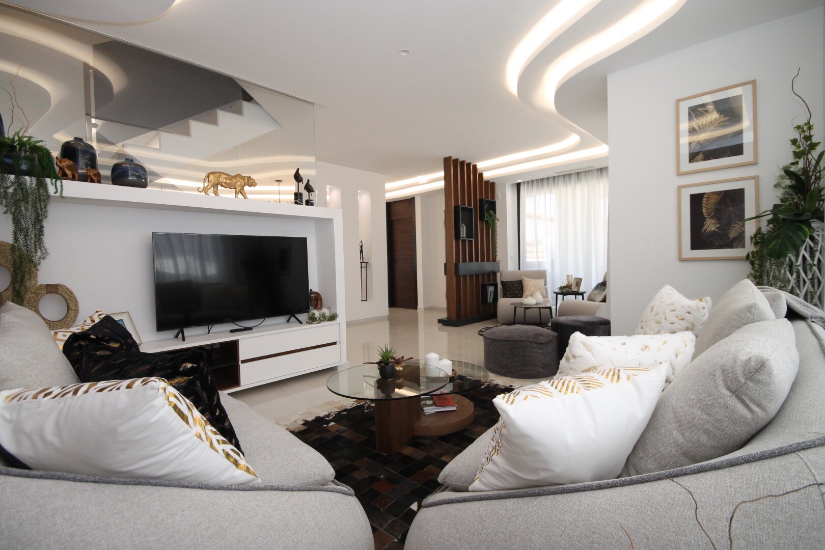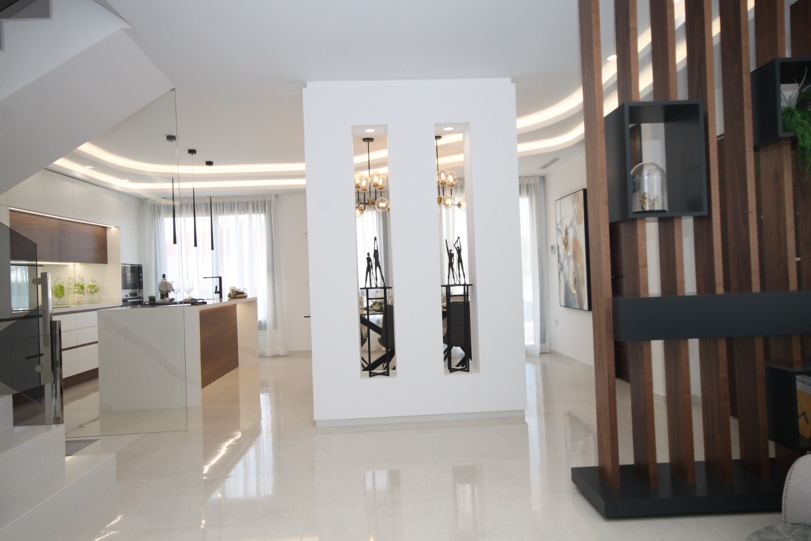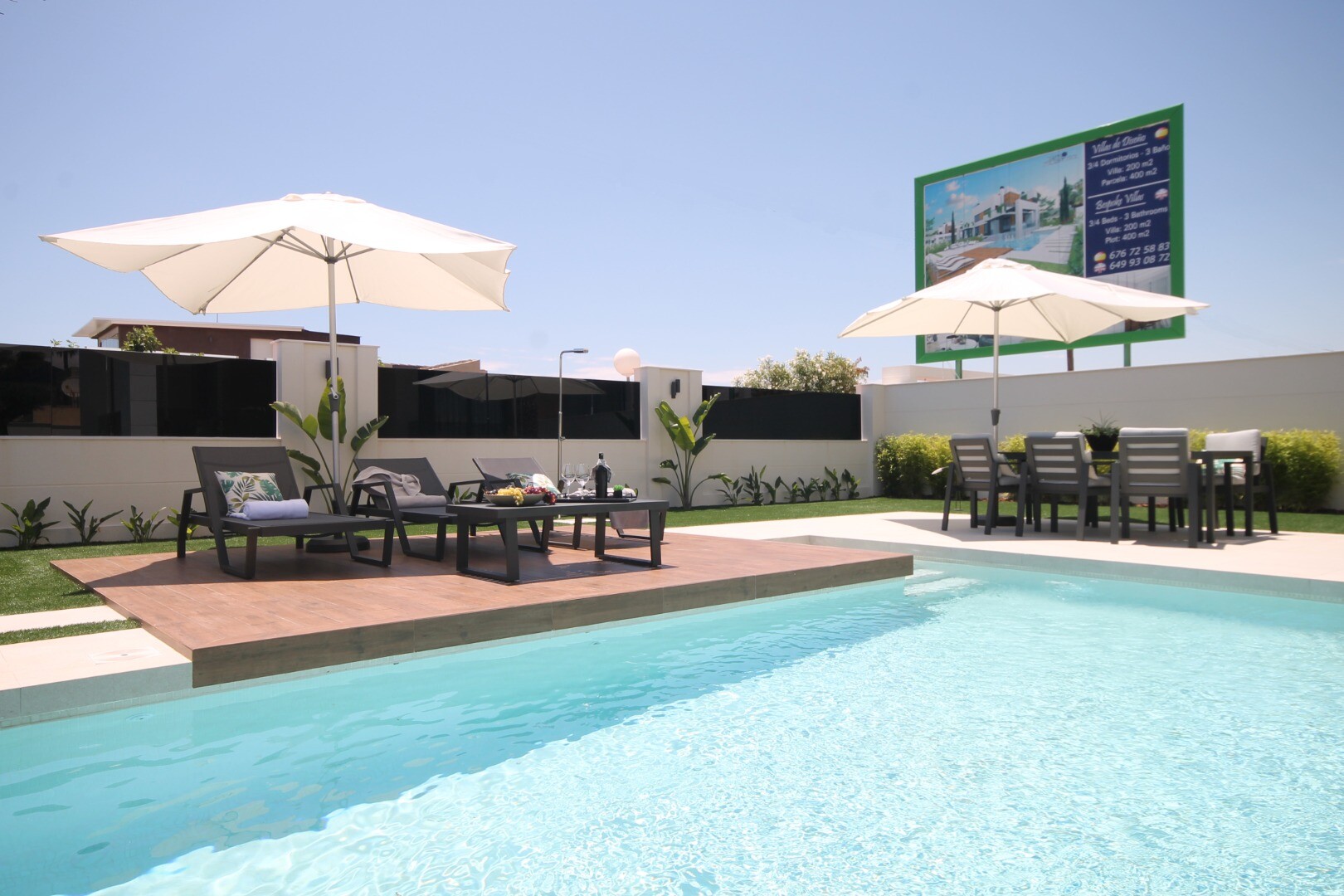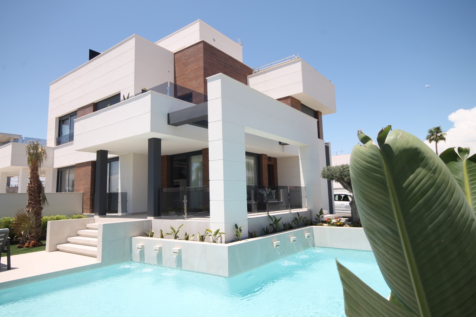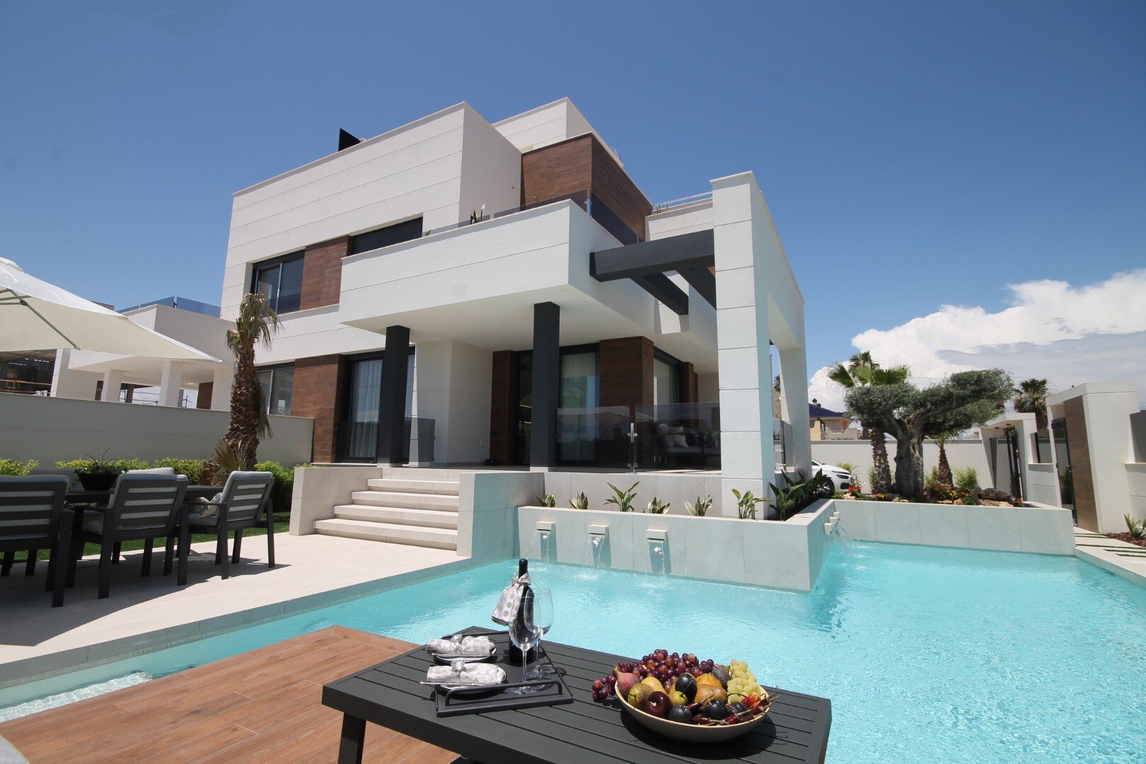 The spectacular private swimming pool with six water fountains creates an atmosphere of luxury and relaxation, while the beautiful garden is perfect for outdoor enjoyment and outdoor activities. This villa is an ideal choice for those looking for a modern, secure and luxurious home in one of the best areas of Torrevieja.